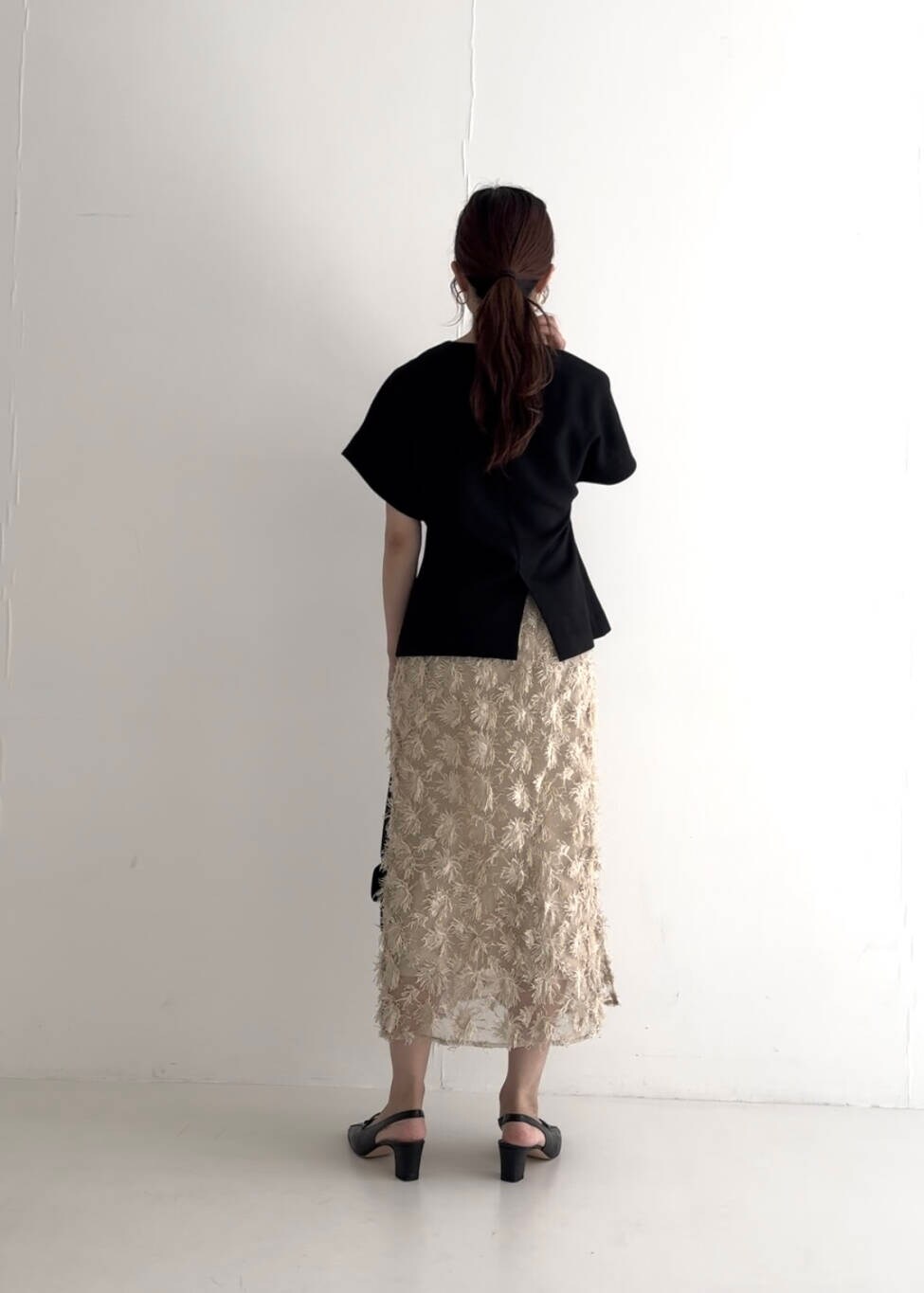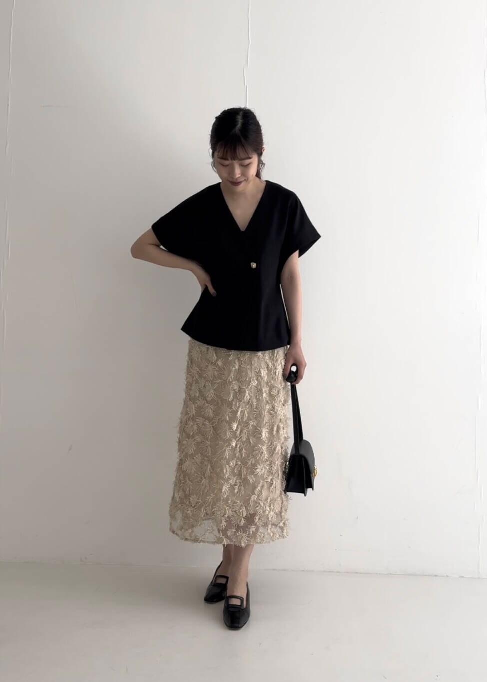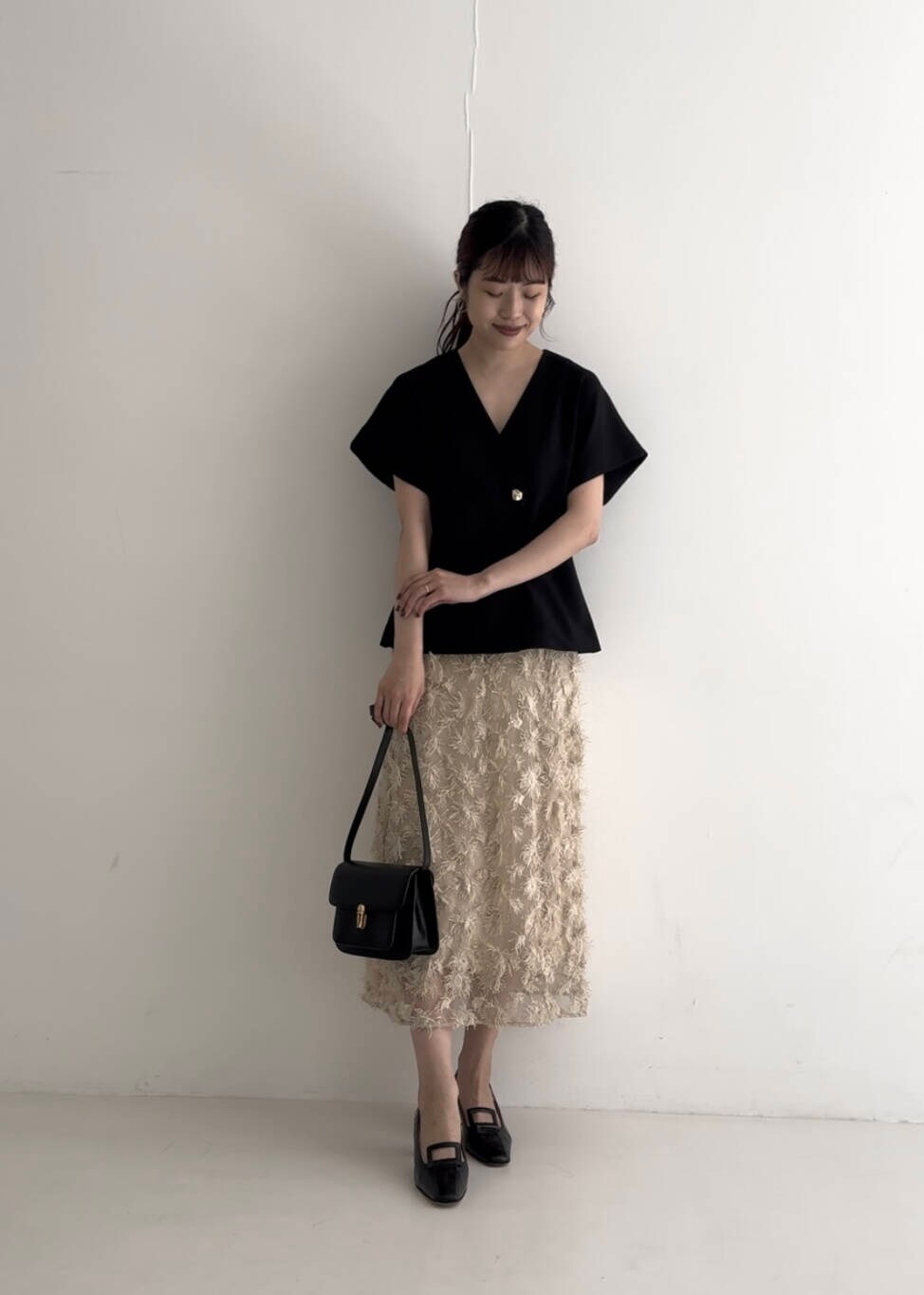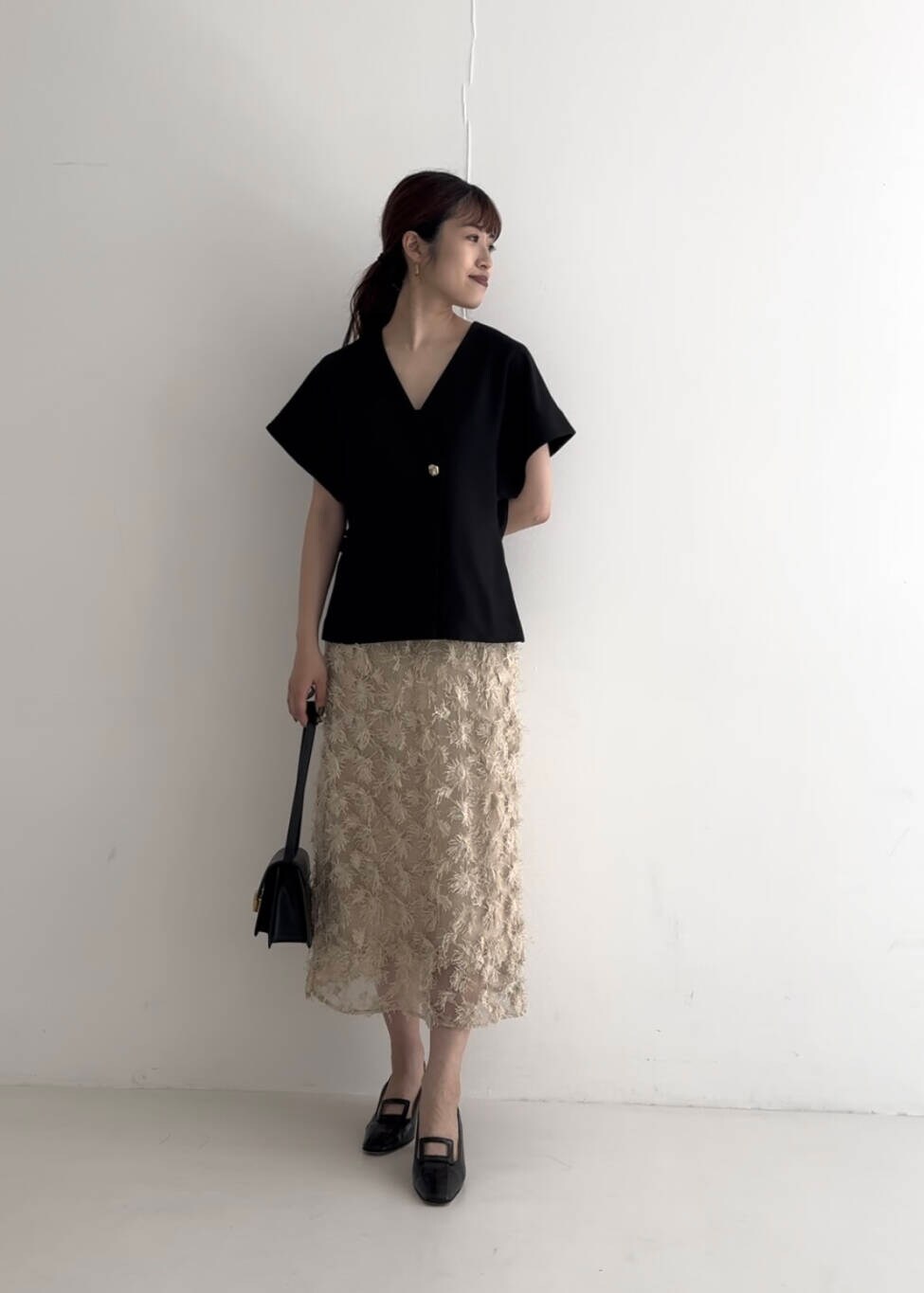 3DシリーズのVネックベストを、レイヤードレーススカートでスタイリングしました♪