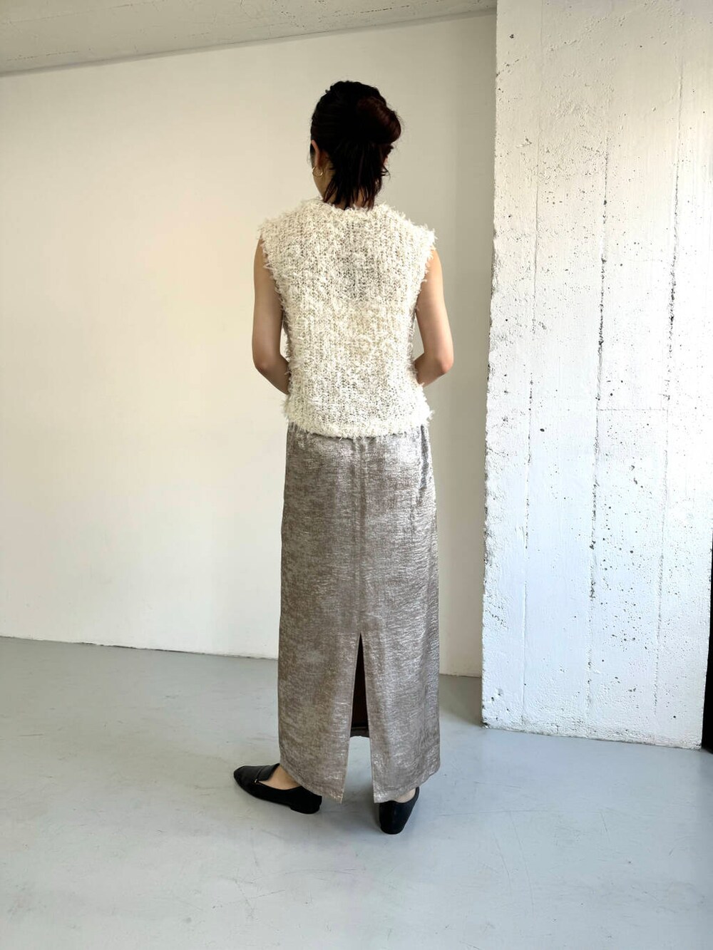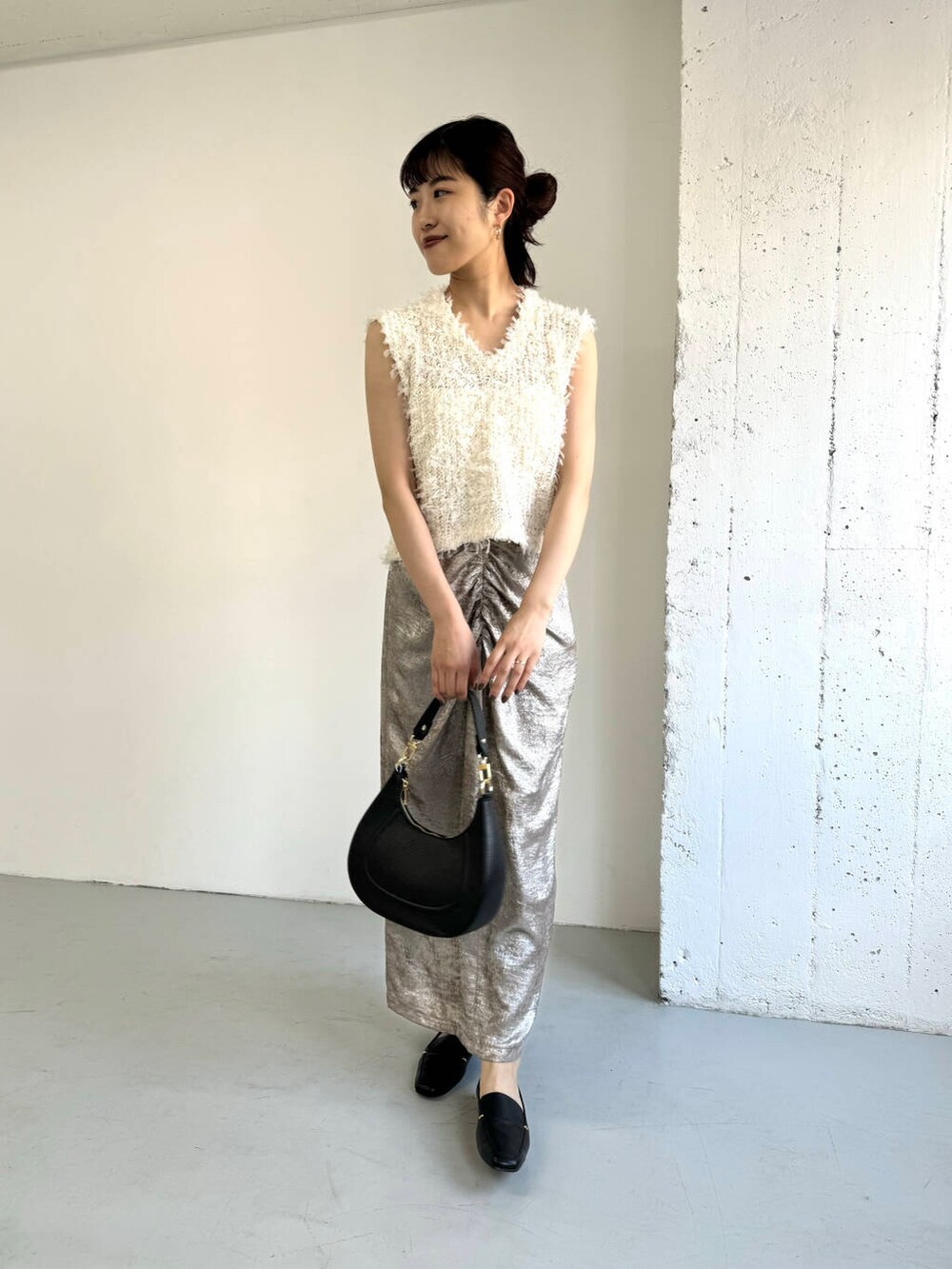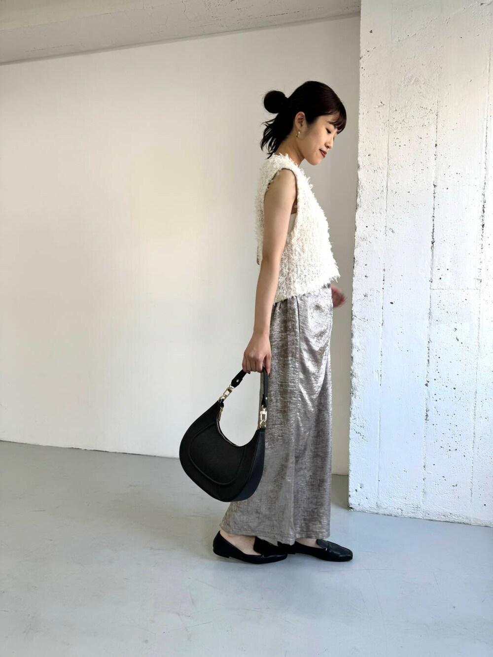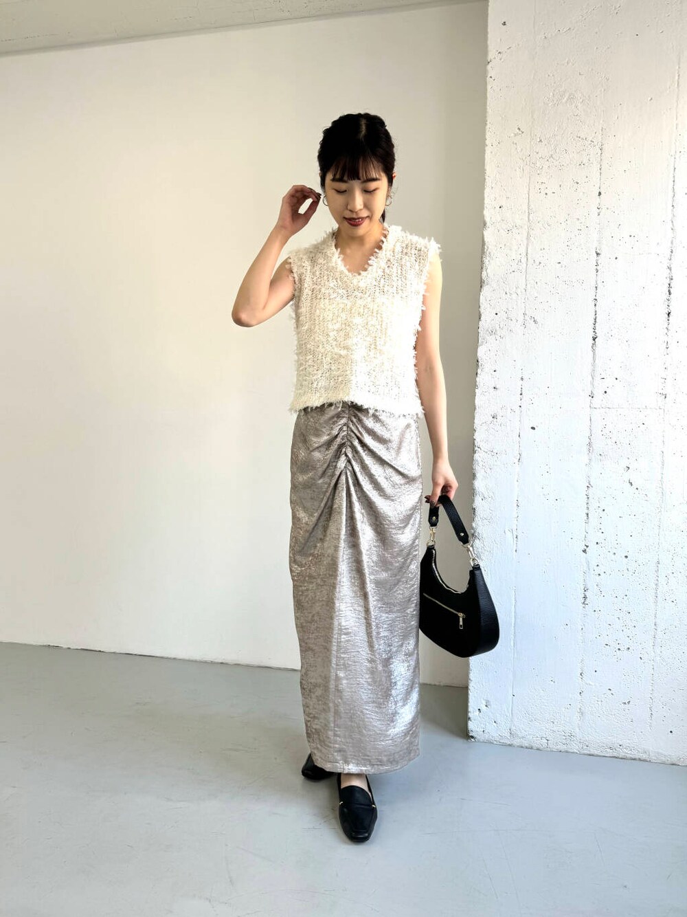 シャイニー素材で、1点取り入れるだけで上級者見えのコーデに。
