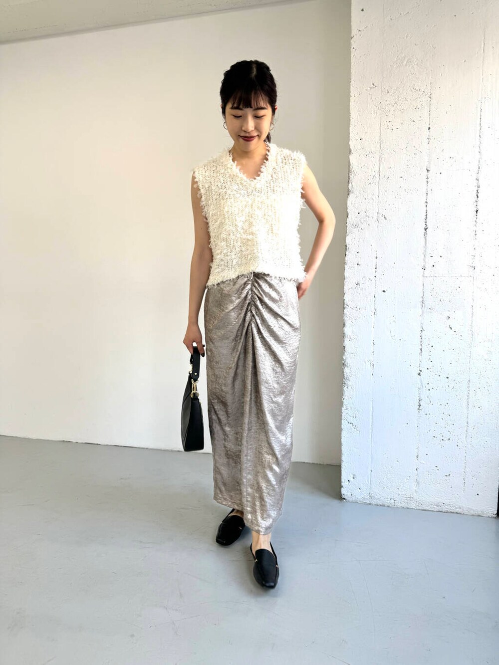 フロントのギャザーデザインが目を惹くタイトスカートを着用しました♪