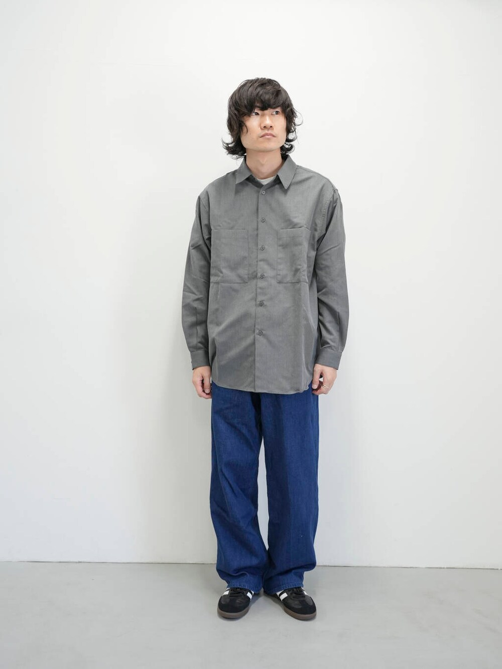 ウール見えする生地を使ったベーシックなシャツでコーディネート。