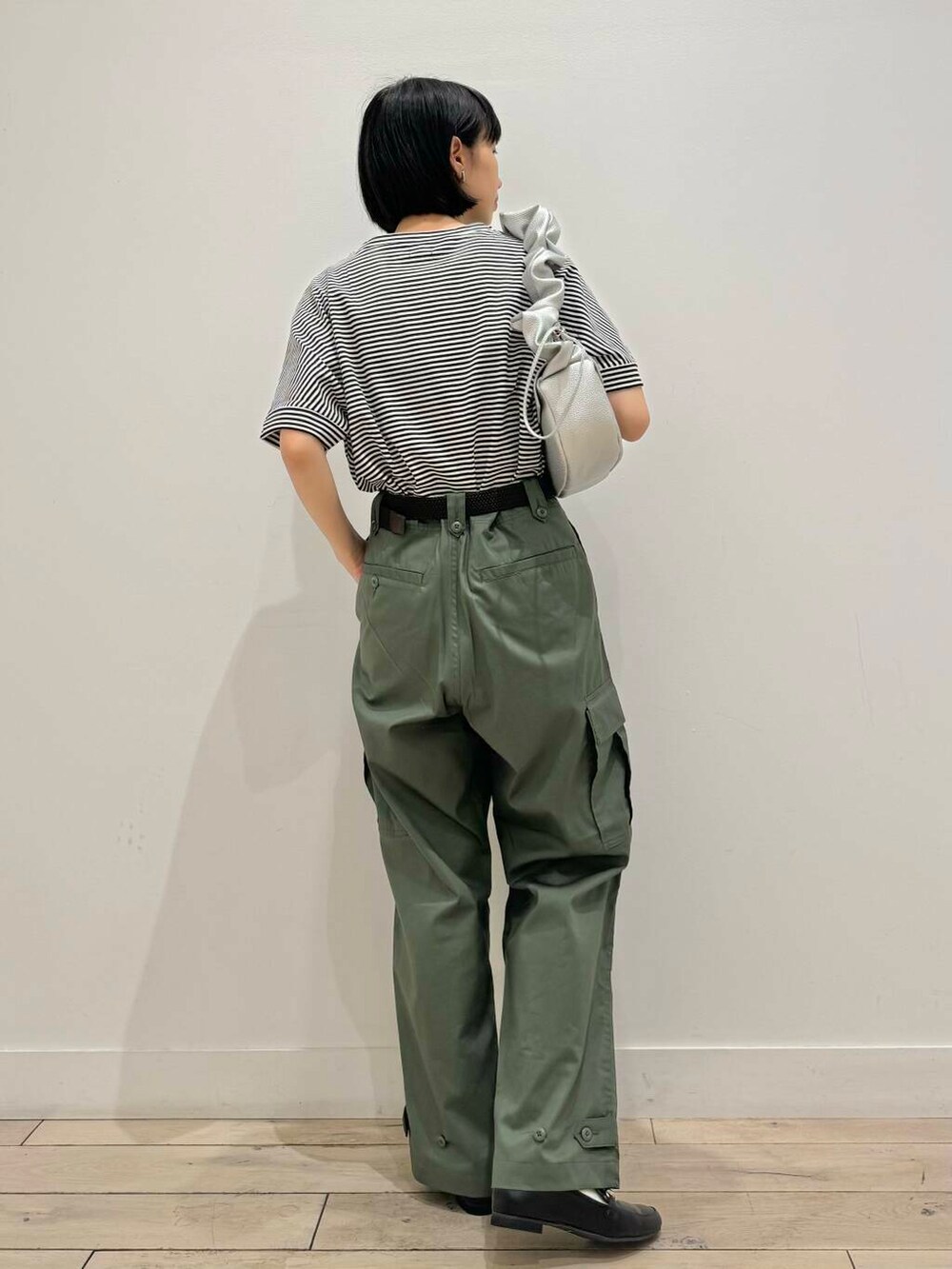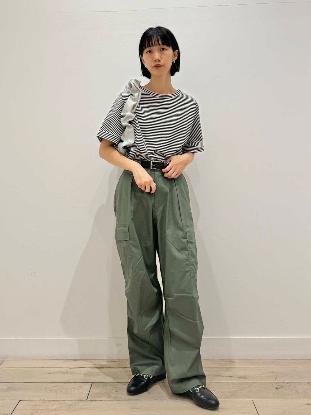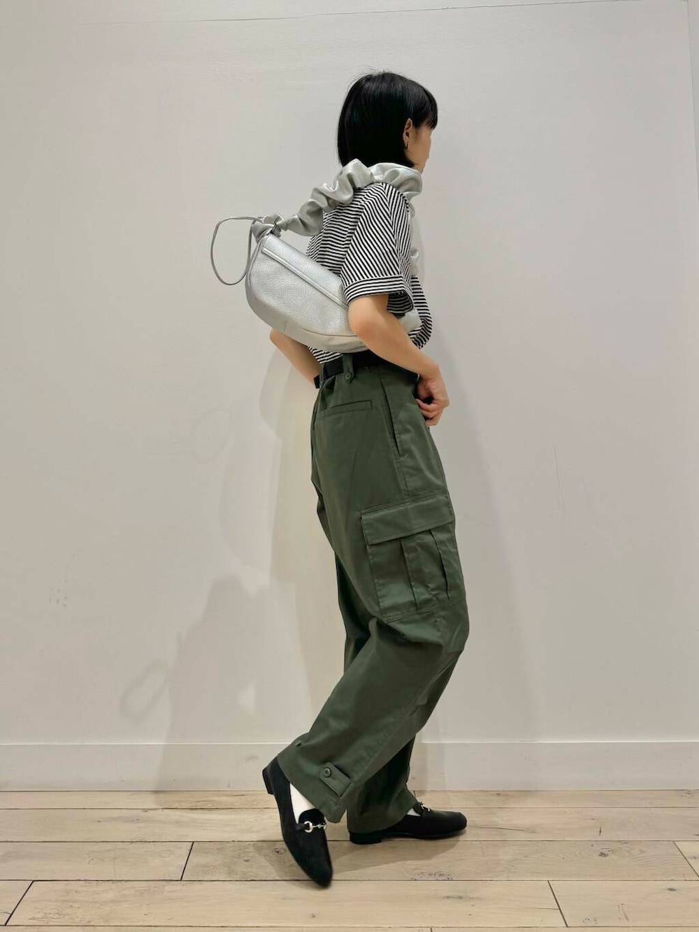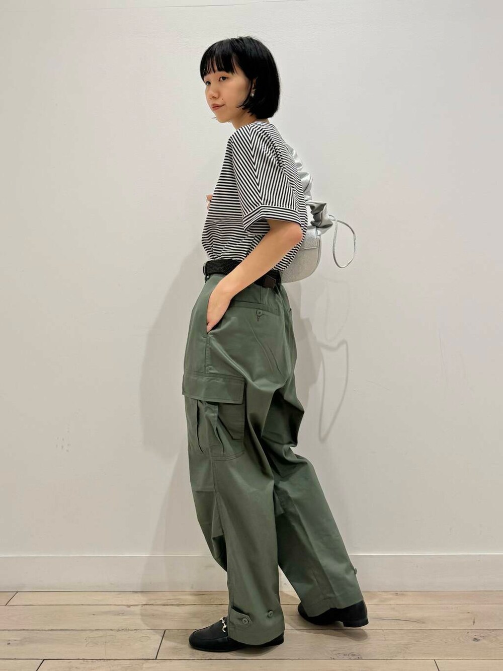 シンプルなのでバッグをデザイン性のあるシルバーのアイテムを合わせました!