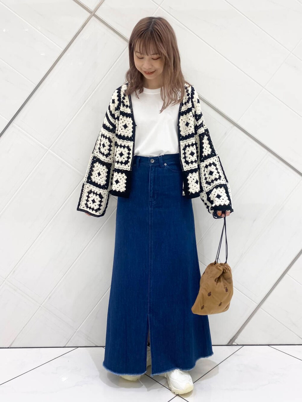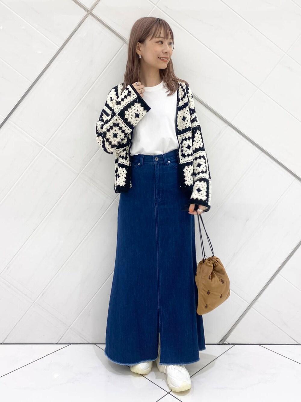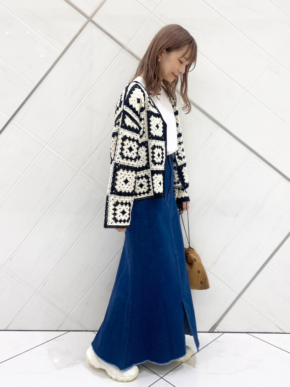 デニムスカートはフレアなのに下半身をスッキリみせてくれるシルエット。