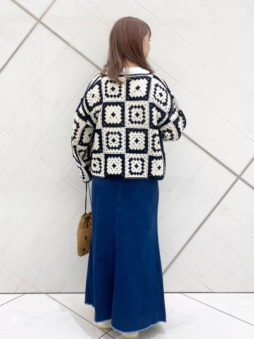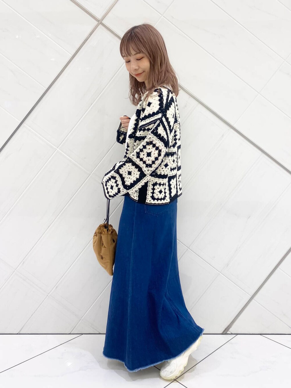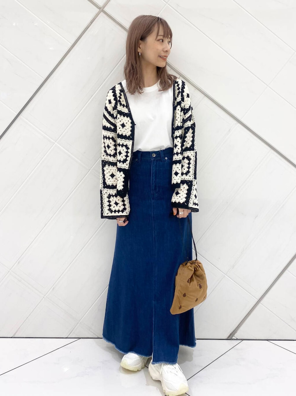 デニムスカートはフレアなのに下半身をスッキリみせてくれるシルエット。