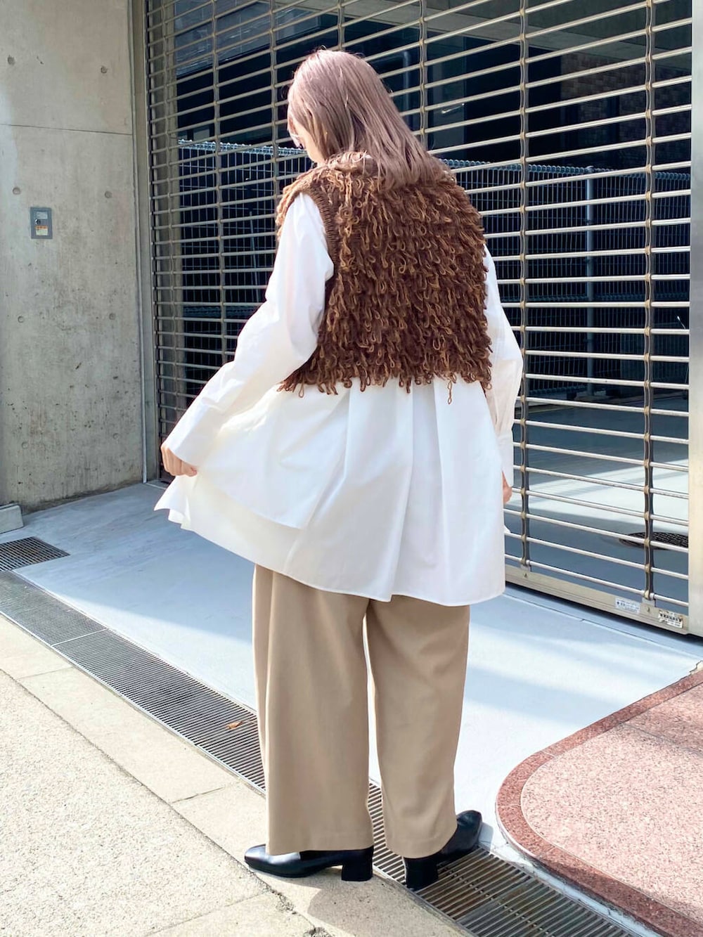 秋らしい深みのあるブラウンのニットベストは、もこもことした質感が秋冬ならではのアイテム!