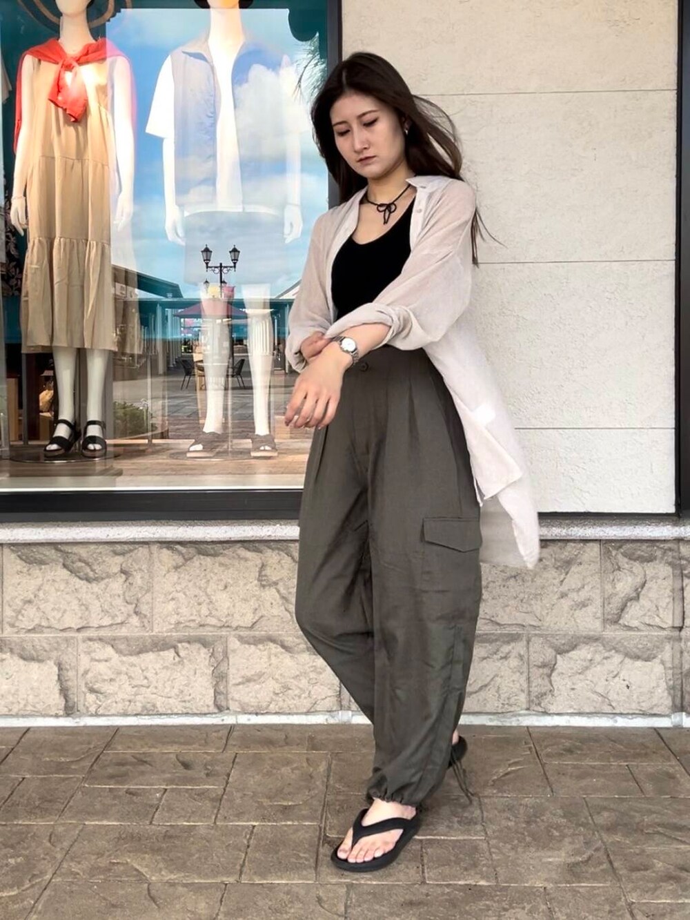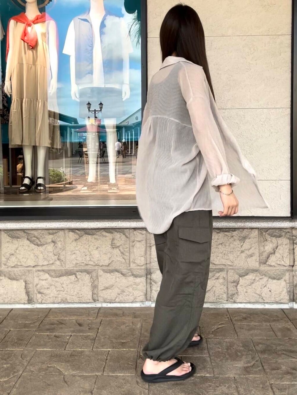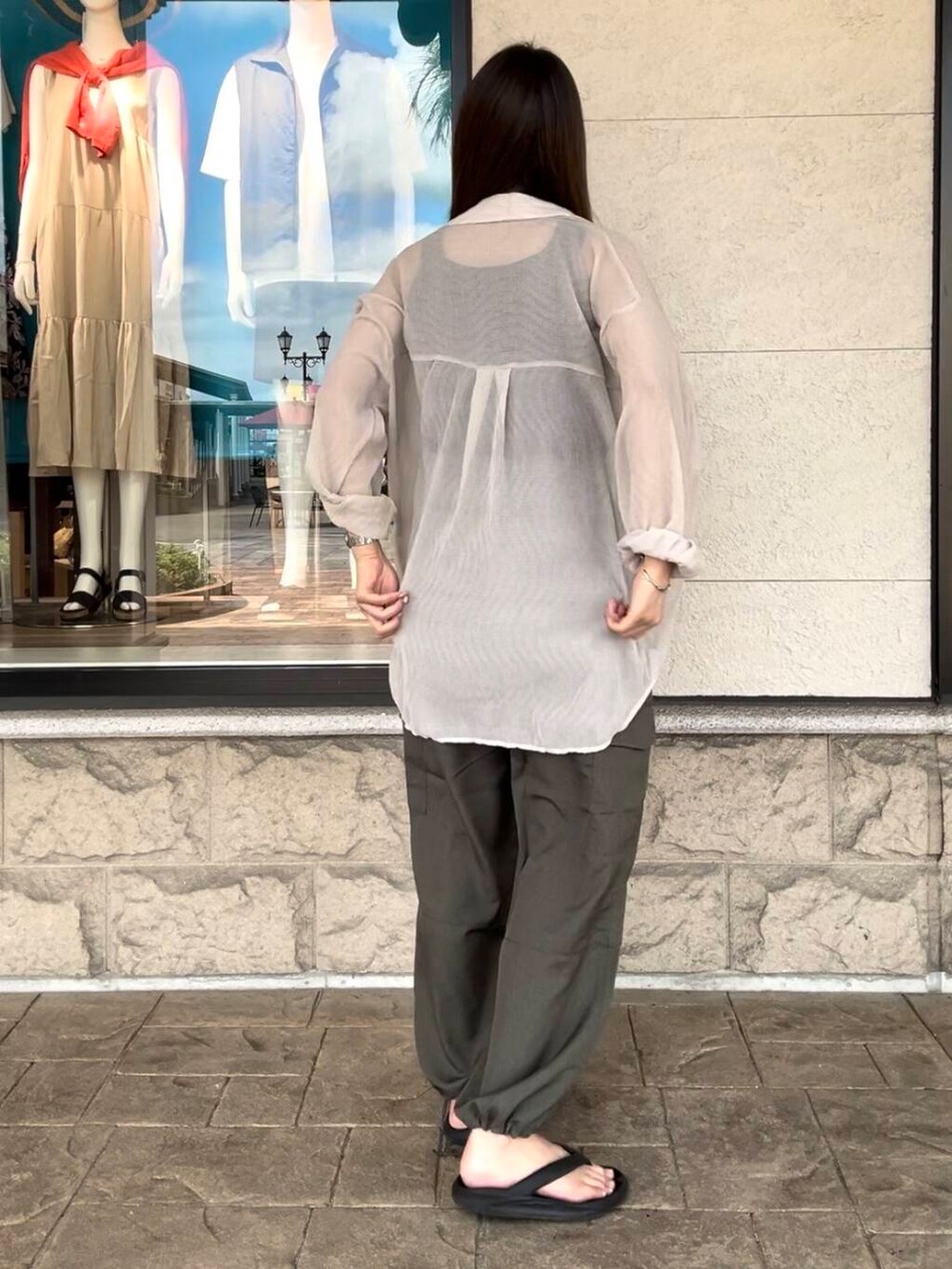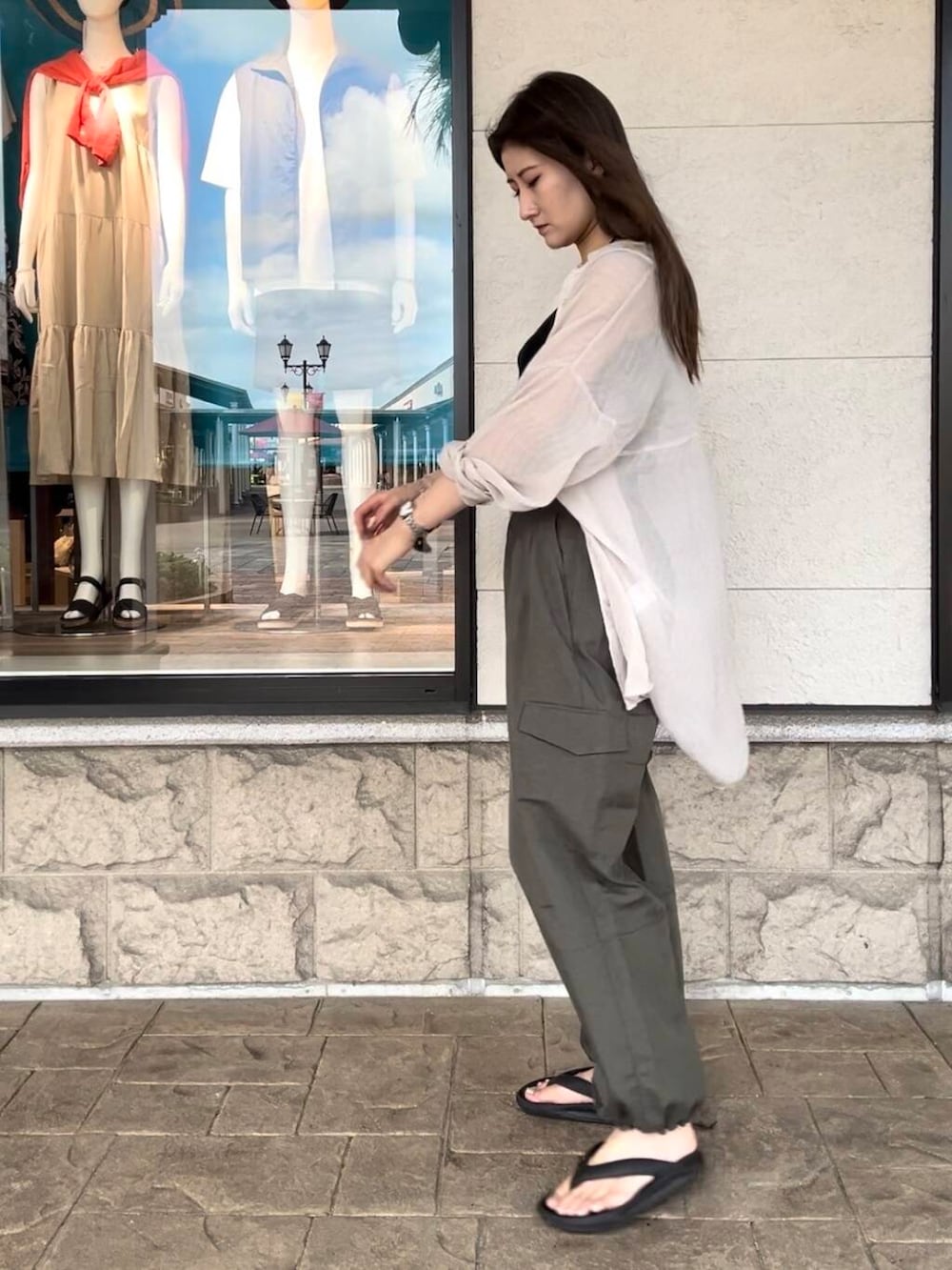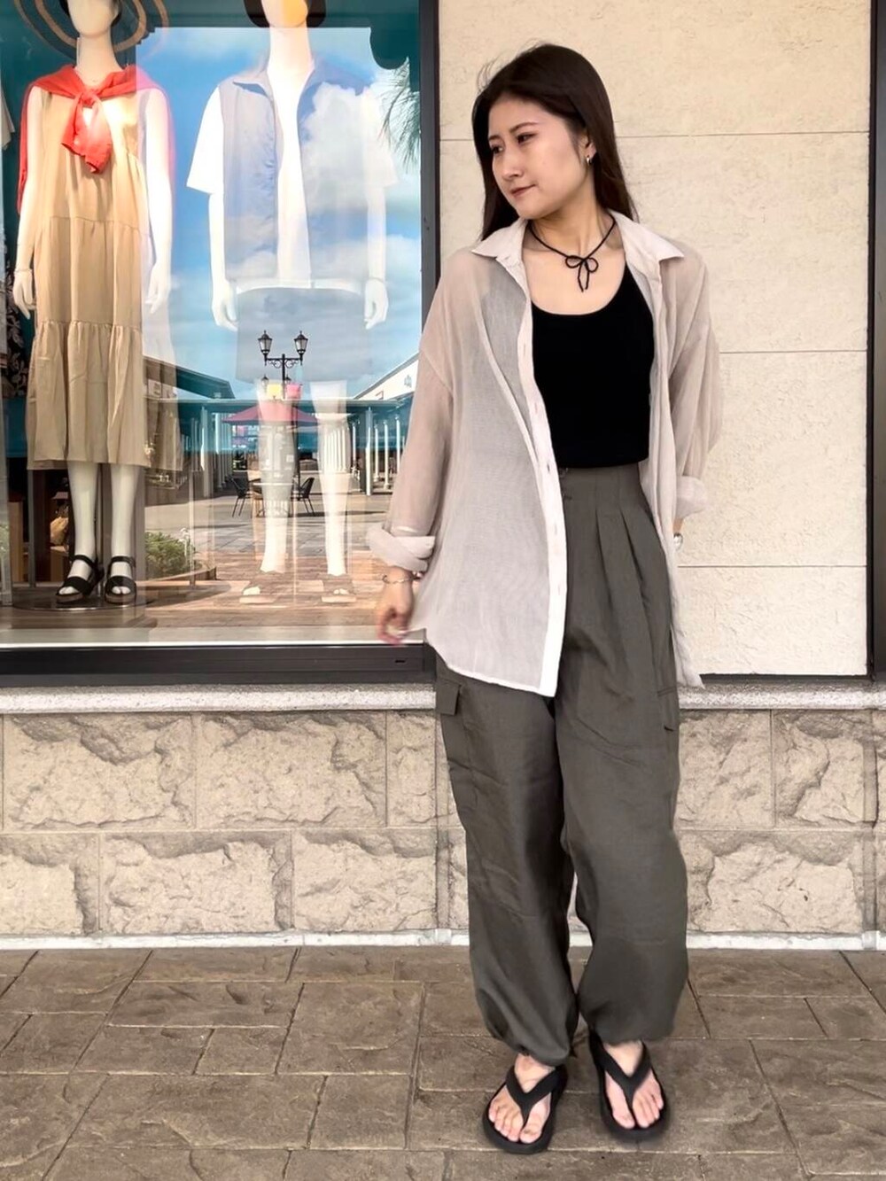 ベージュの透け感とカーキのパンツが相性抜群です◎