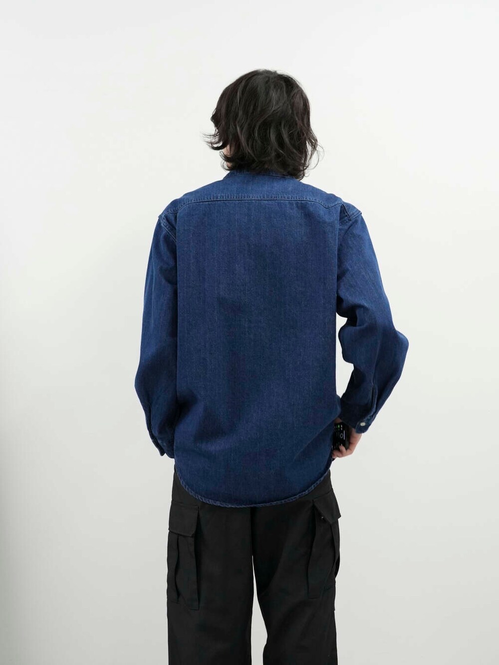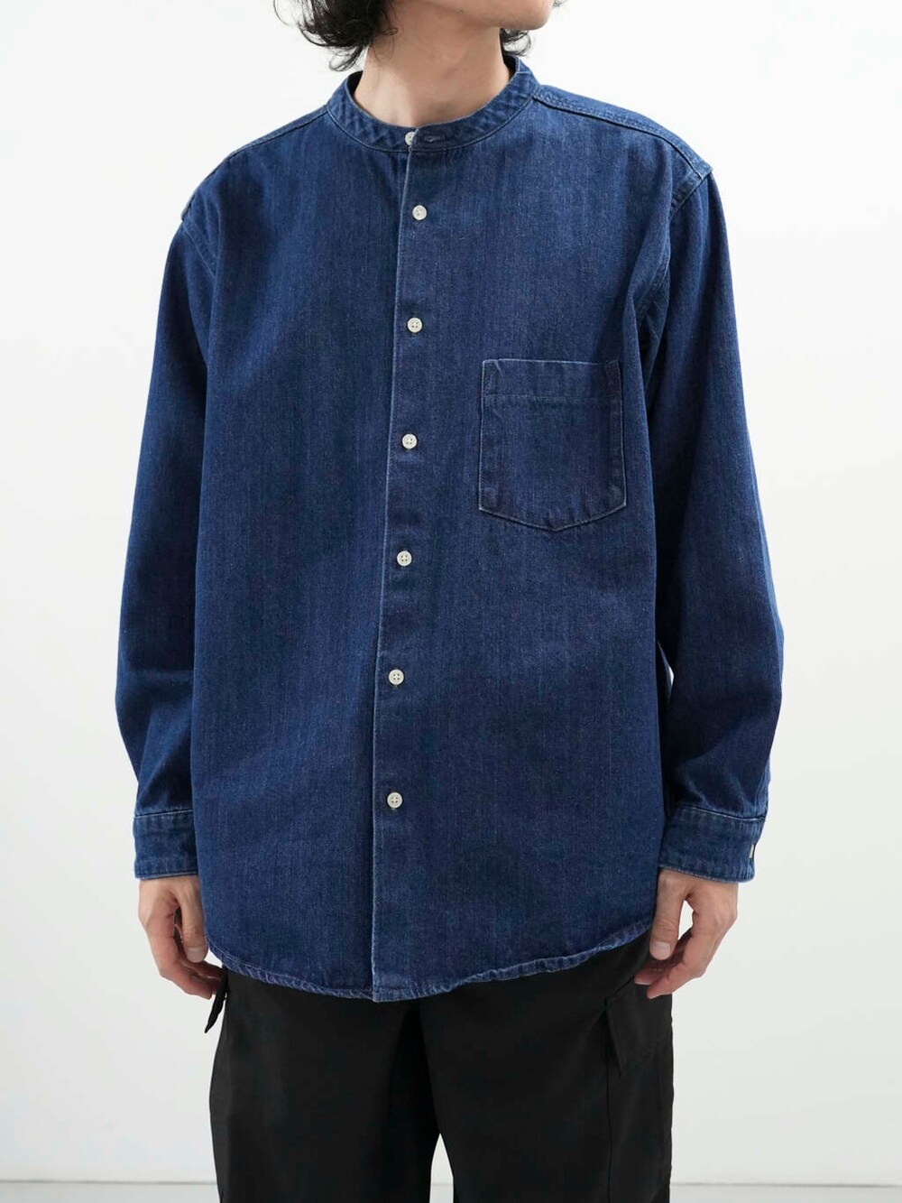 デニムバンドカラーシャツとカーゴパンツのシンプルなコーデ。