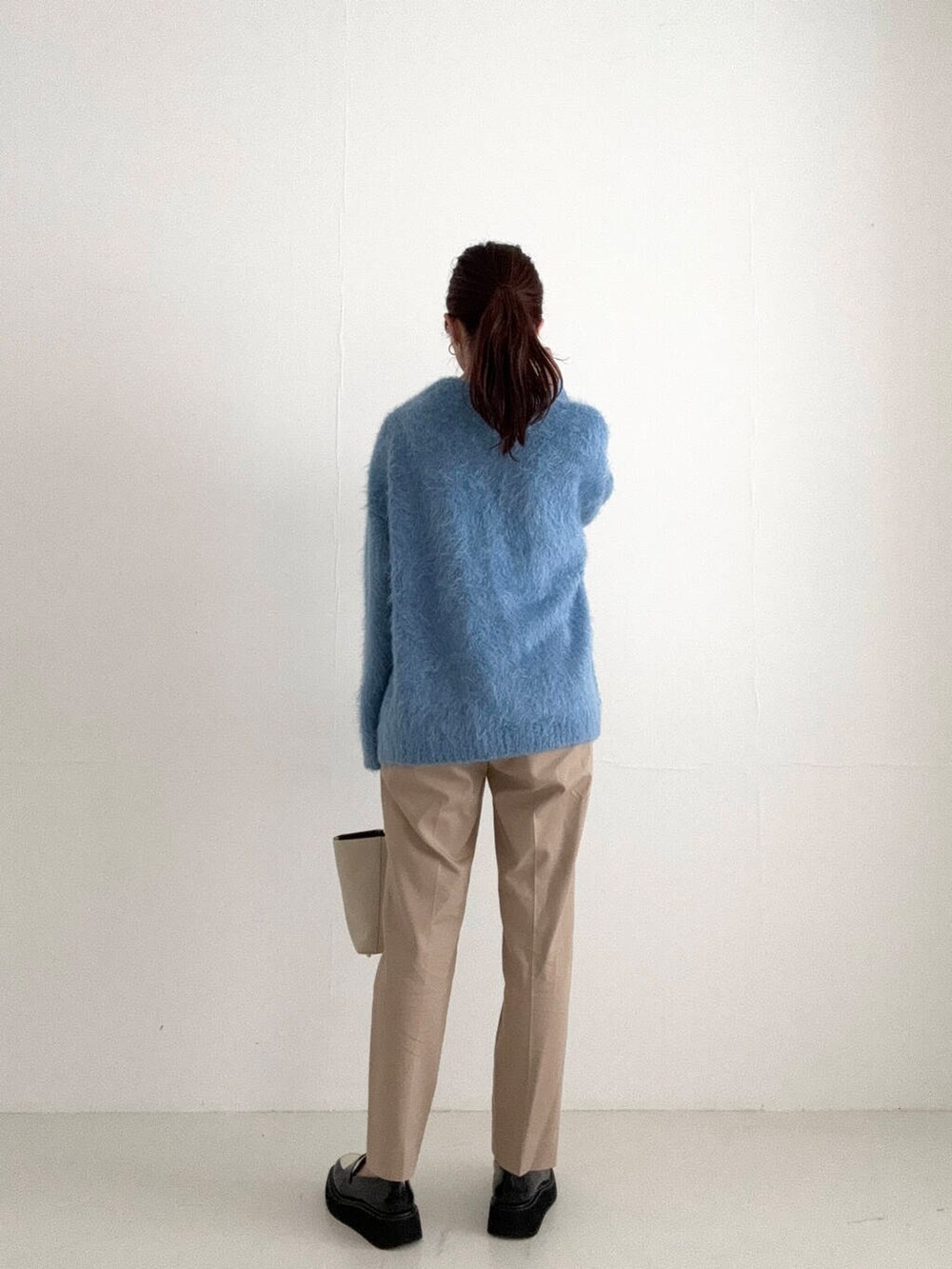 着丈はヒップが隠れるぐらいの丈感のため、少し細めのボトムとバランスをとると