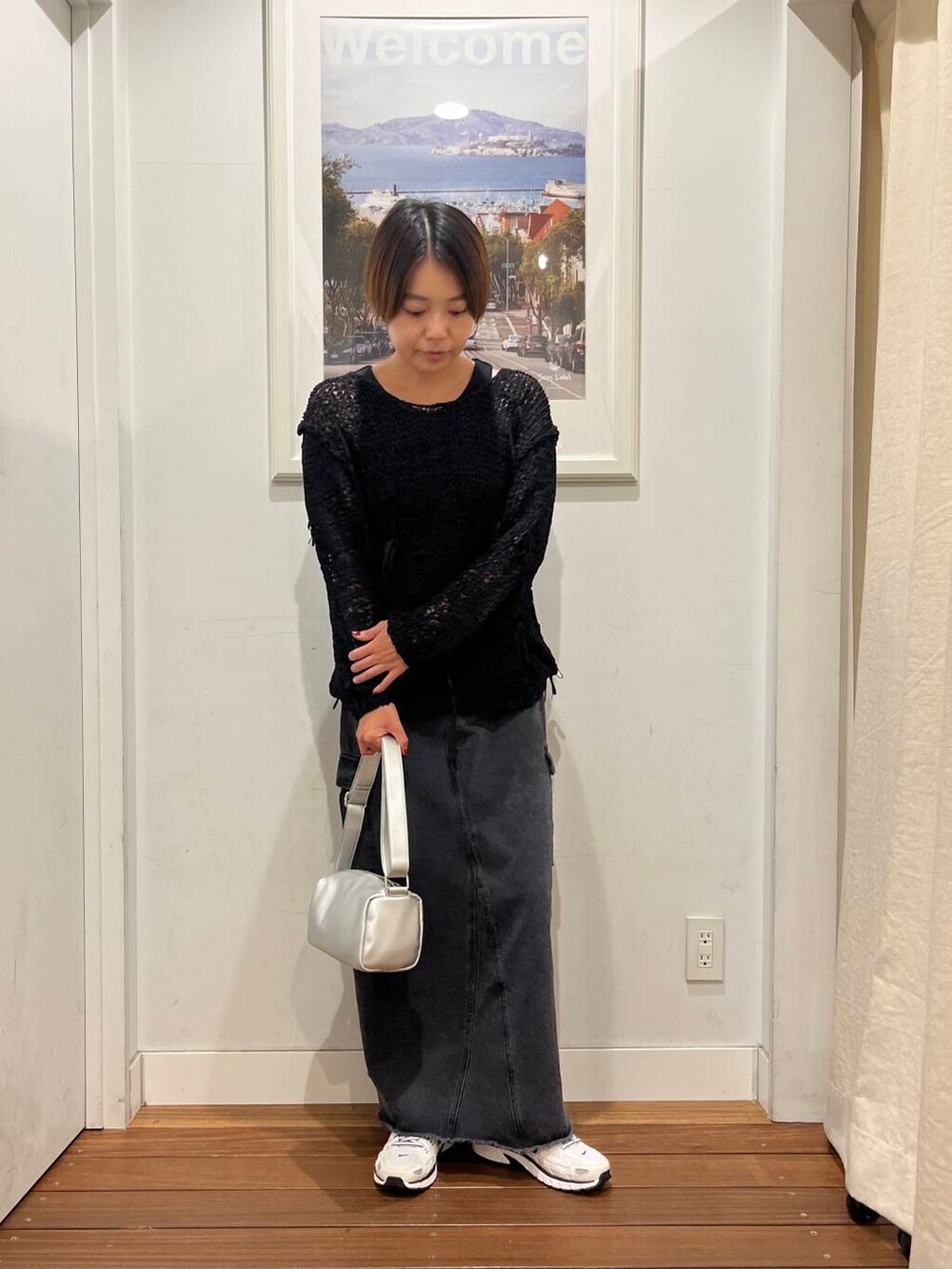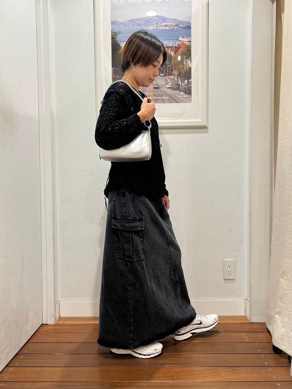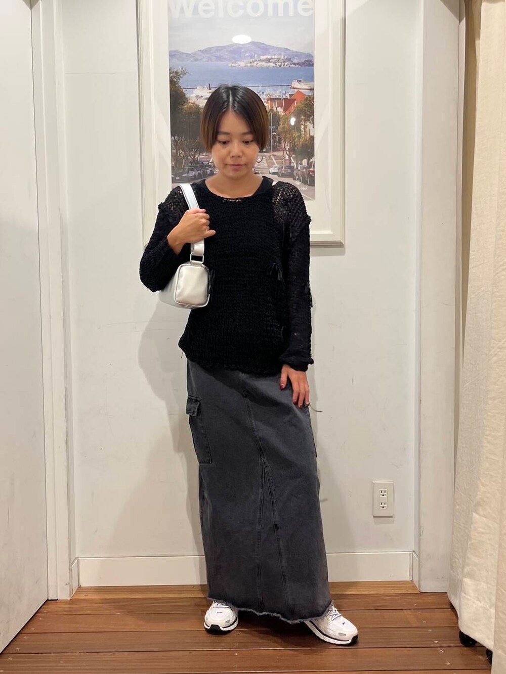 着用のデニムスカートは、柔らかく履き心地good!!ロングのデニムスカートって珍しいですよね!!サイズは2サイズになりますので是非チェックしてみて下さい。