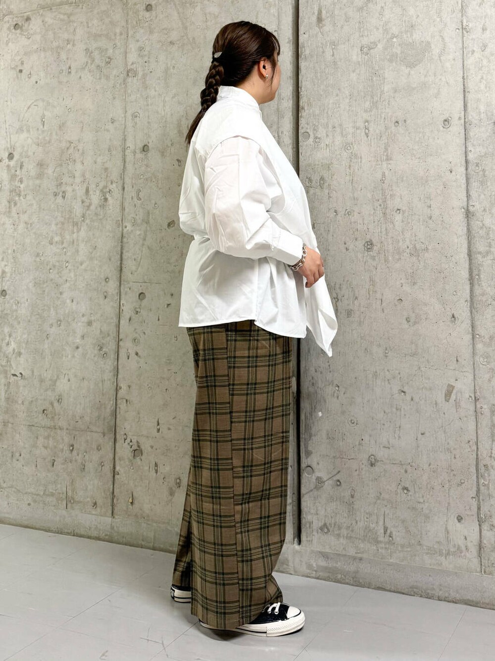 シャツはオーバーサイズで着やすく、レイヤードデザインなのでシンプルになりがちなシャツがおしゃれになって◎