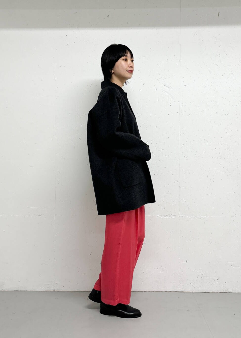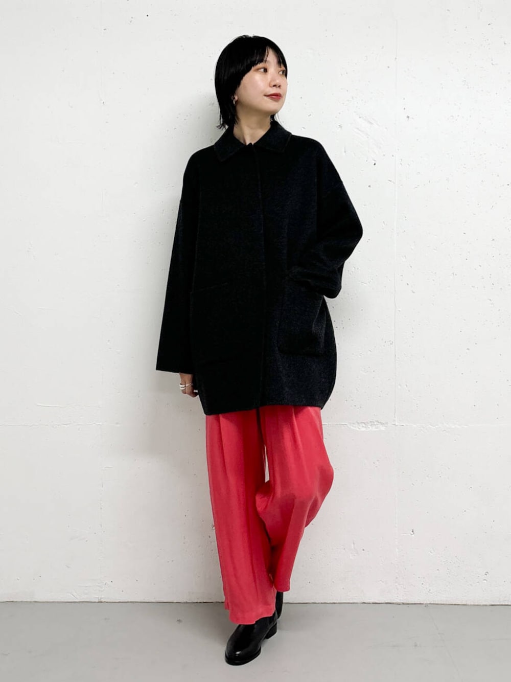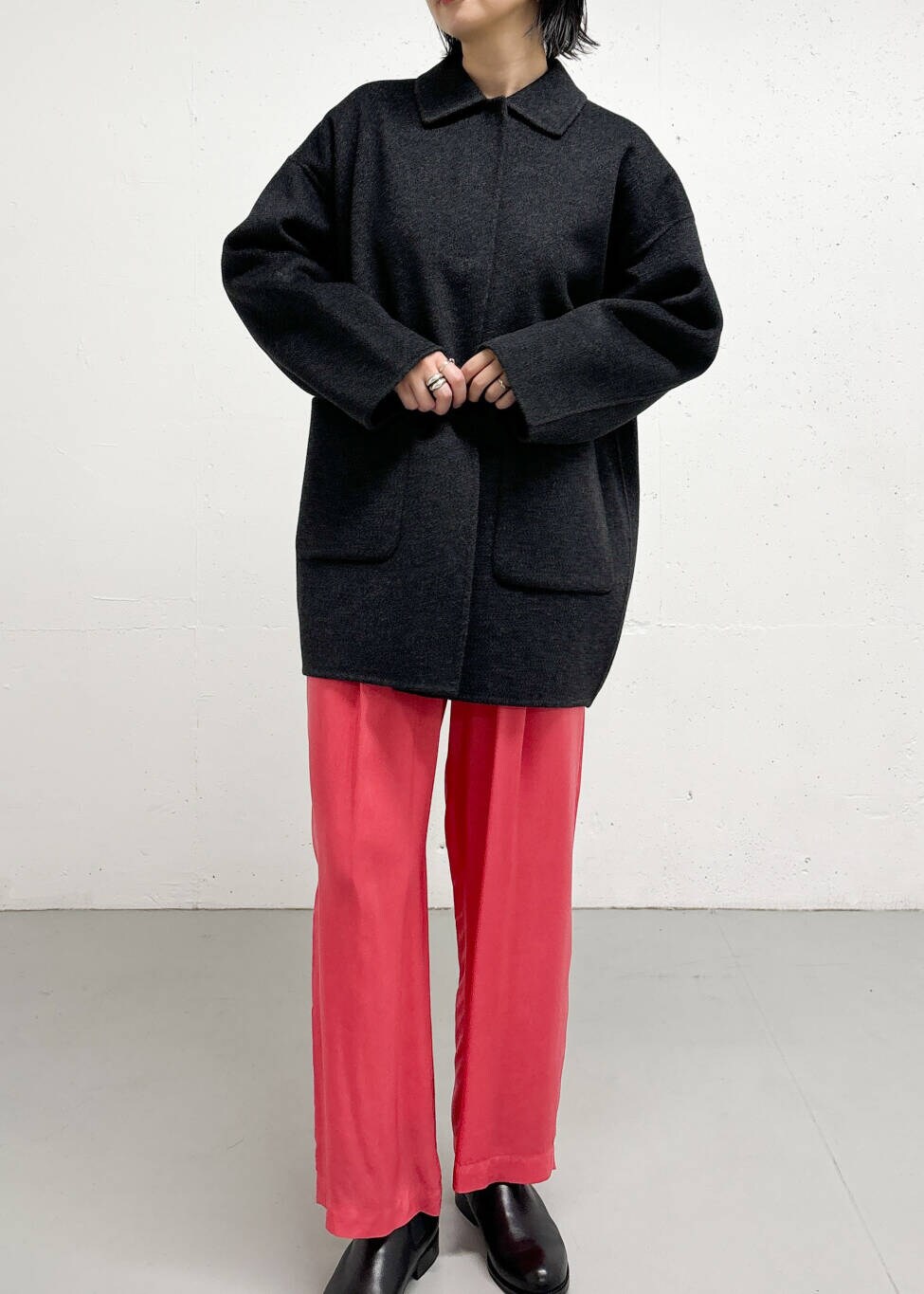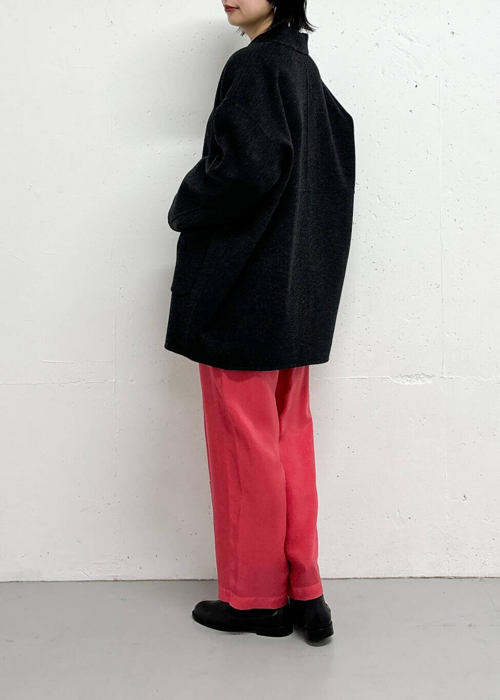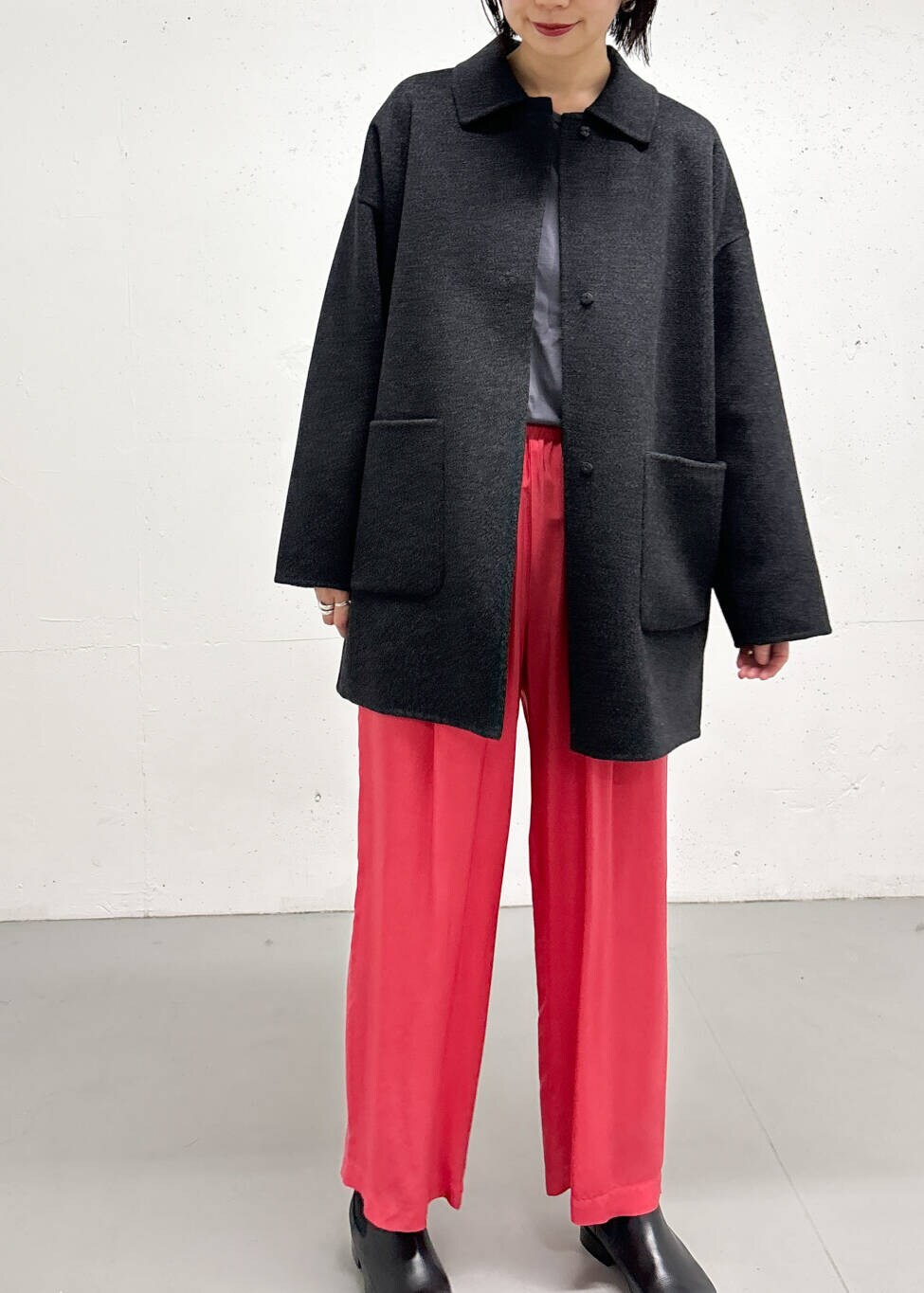 チャコールならカラーパンツを合わせても色差が強すぎなくて◎