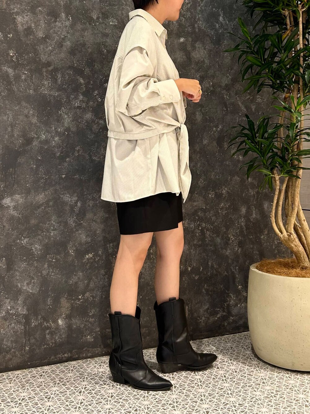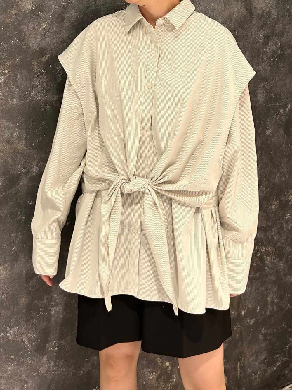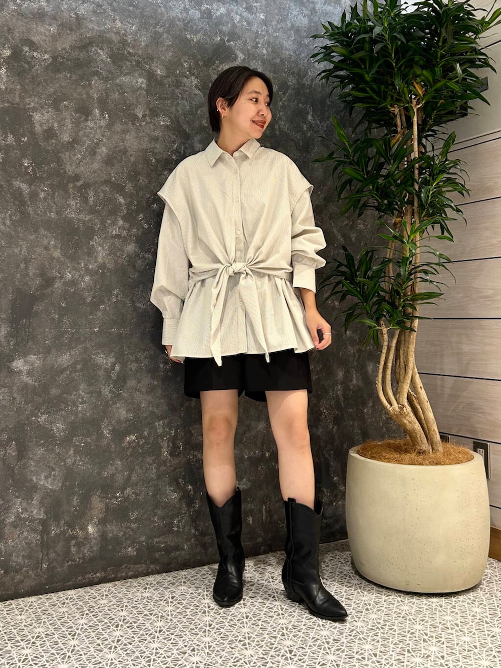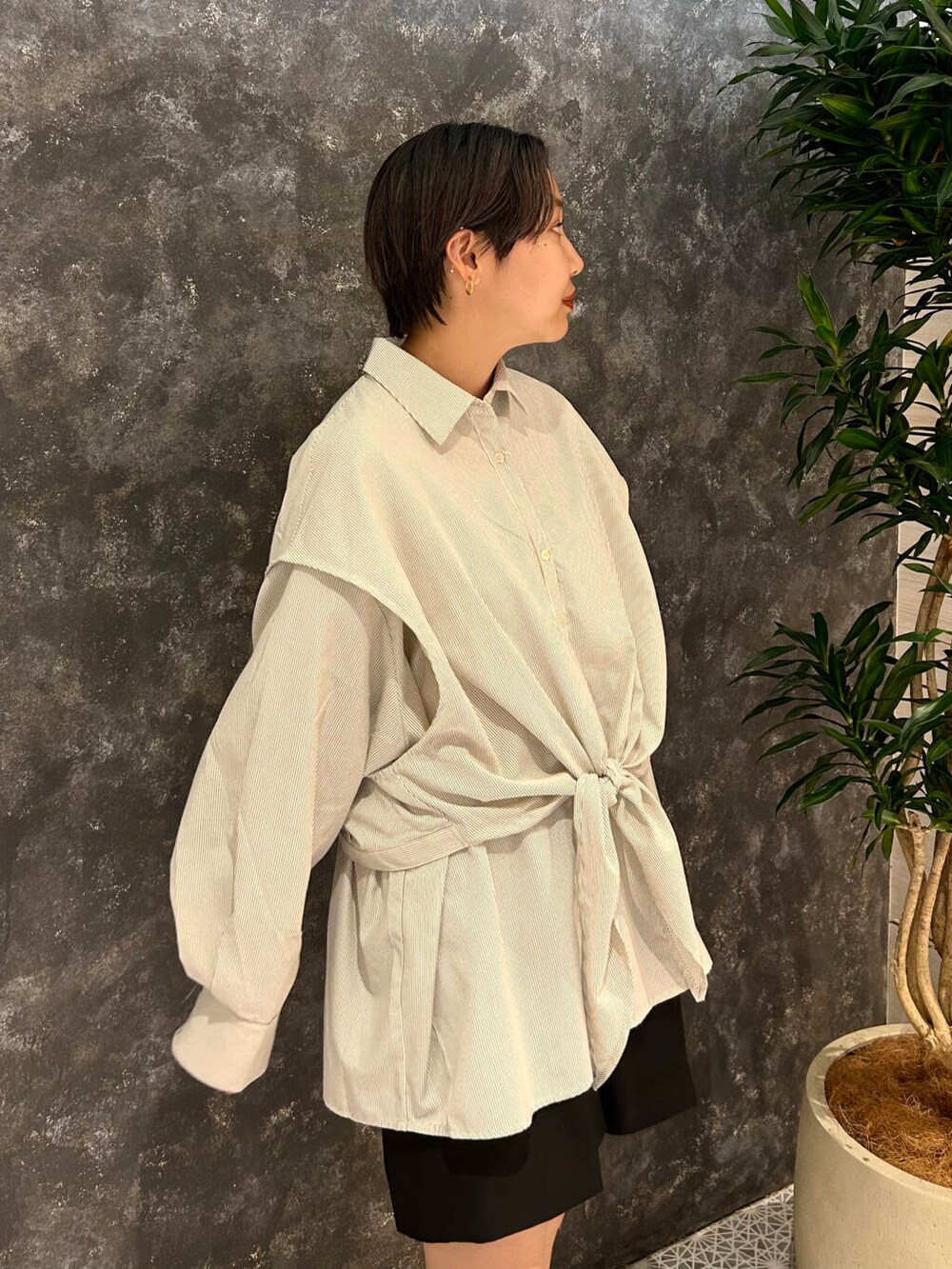 フロントのレイヤード部分を結んでウエストマークするとメリハリが出るのでおすすめです🩷