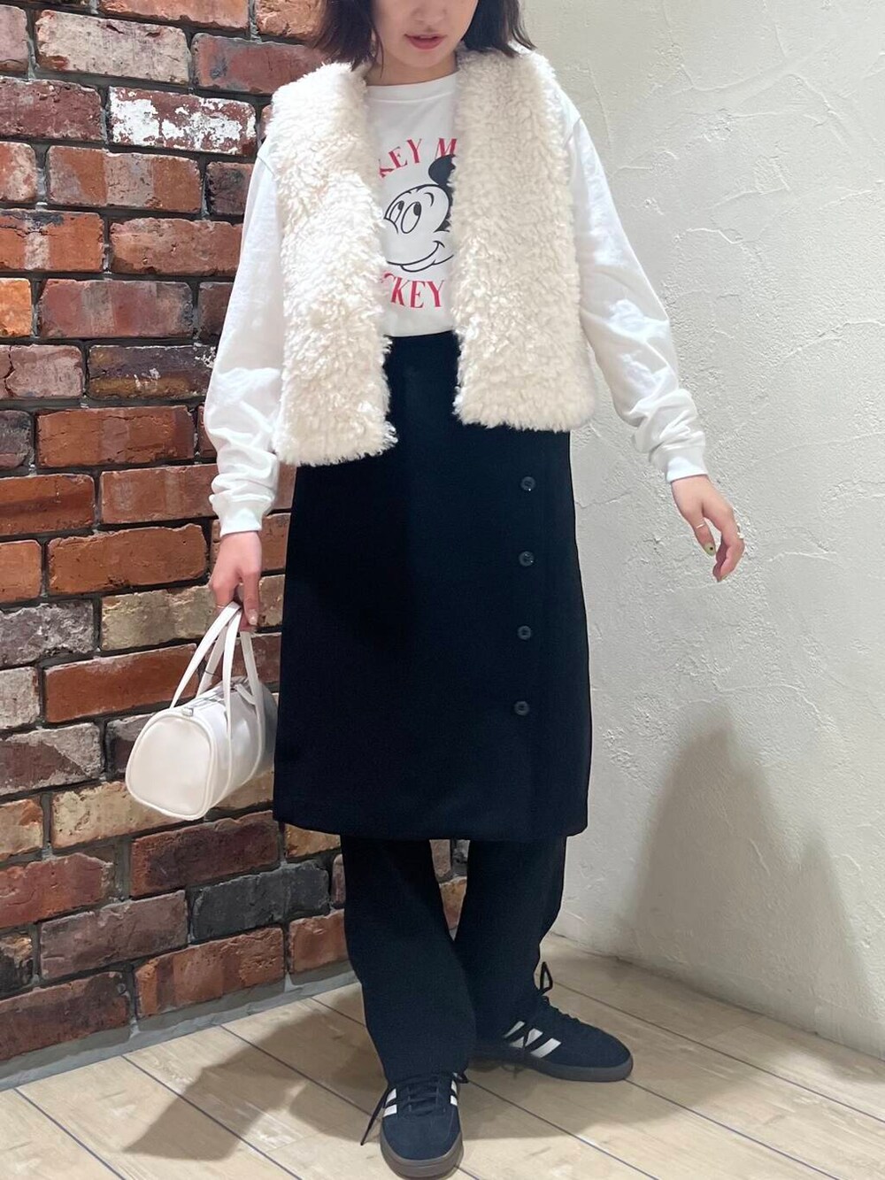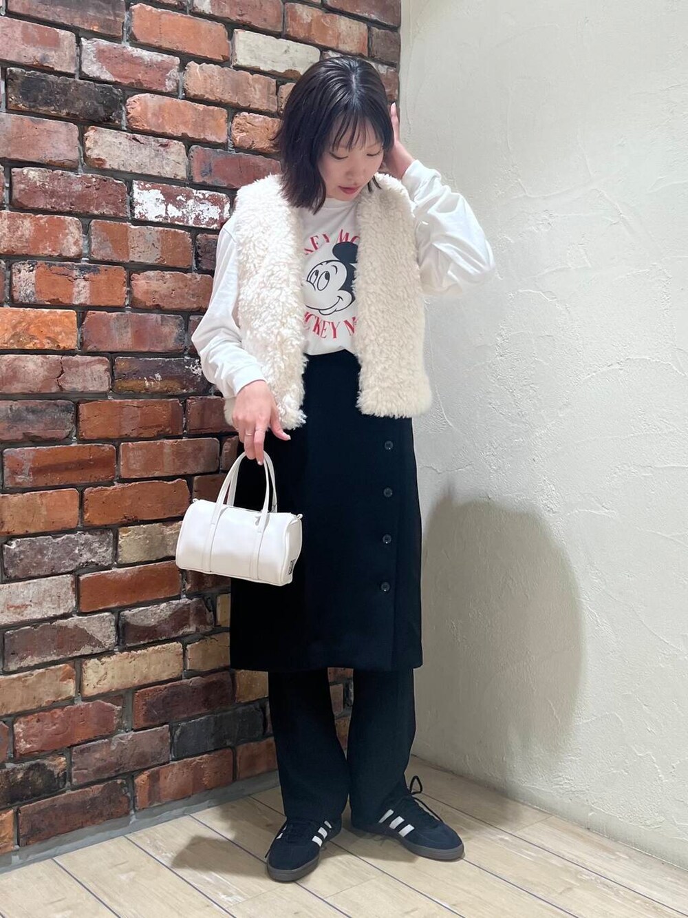 上下モノトーンの合わせに、mickey プリントを覗かせて、遊び心を加えました◎