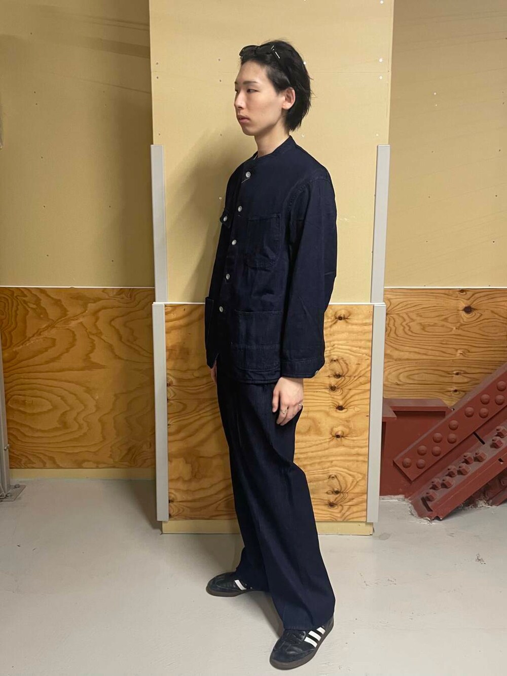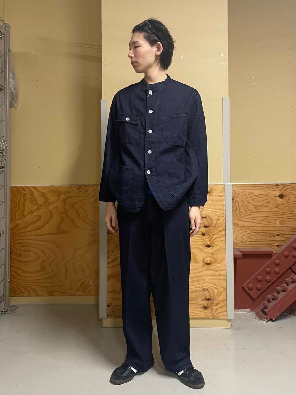 バンドカラーにより、すっきりとキレイめな印象で、デニムオンデニムでも重くなりすぎずに着ることができます。