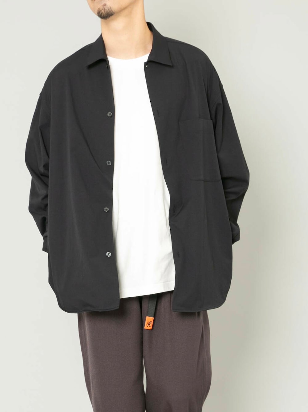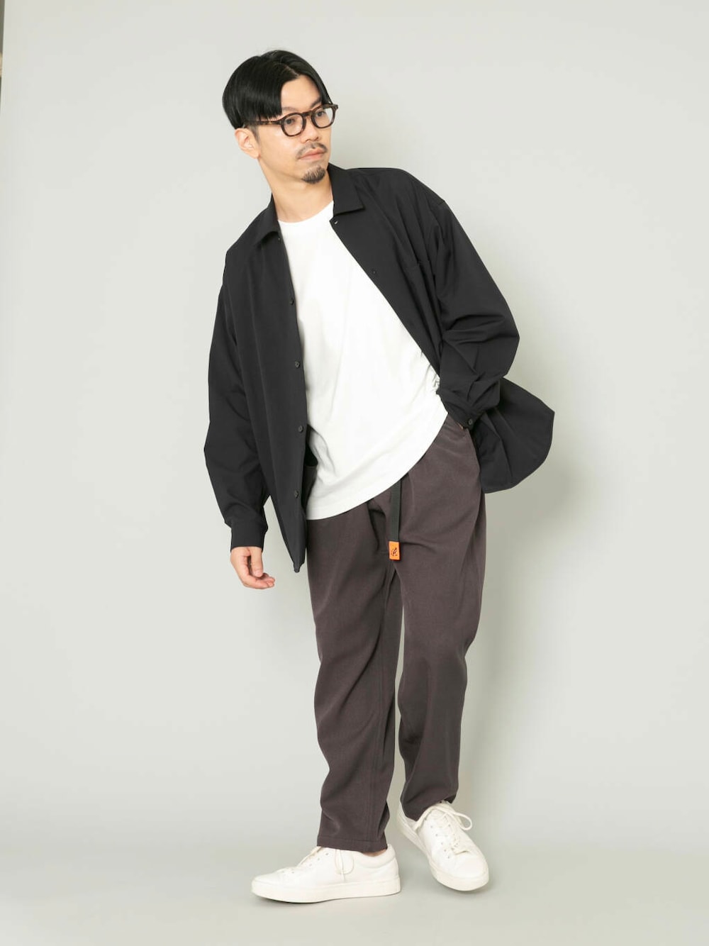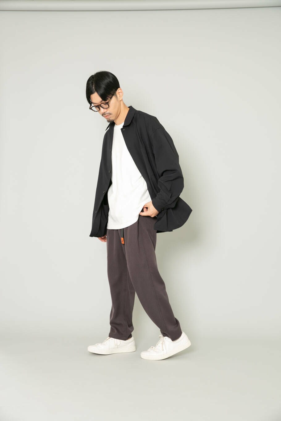 さらっとジャケット感覚で羽織れるリラックスシャツジャケットにきれいめコーデにも相性の良い別注ぐれ道の新作を合わせて。