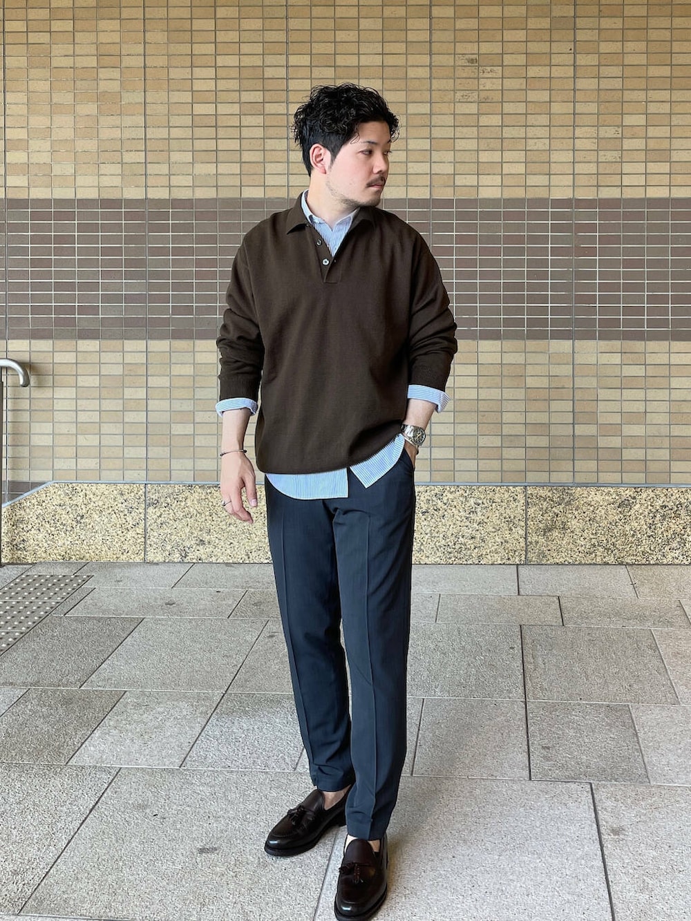 先日ご紹介したニットポロを使ってスタイリング。