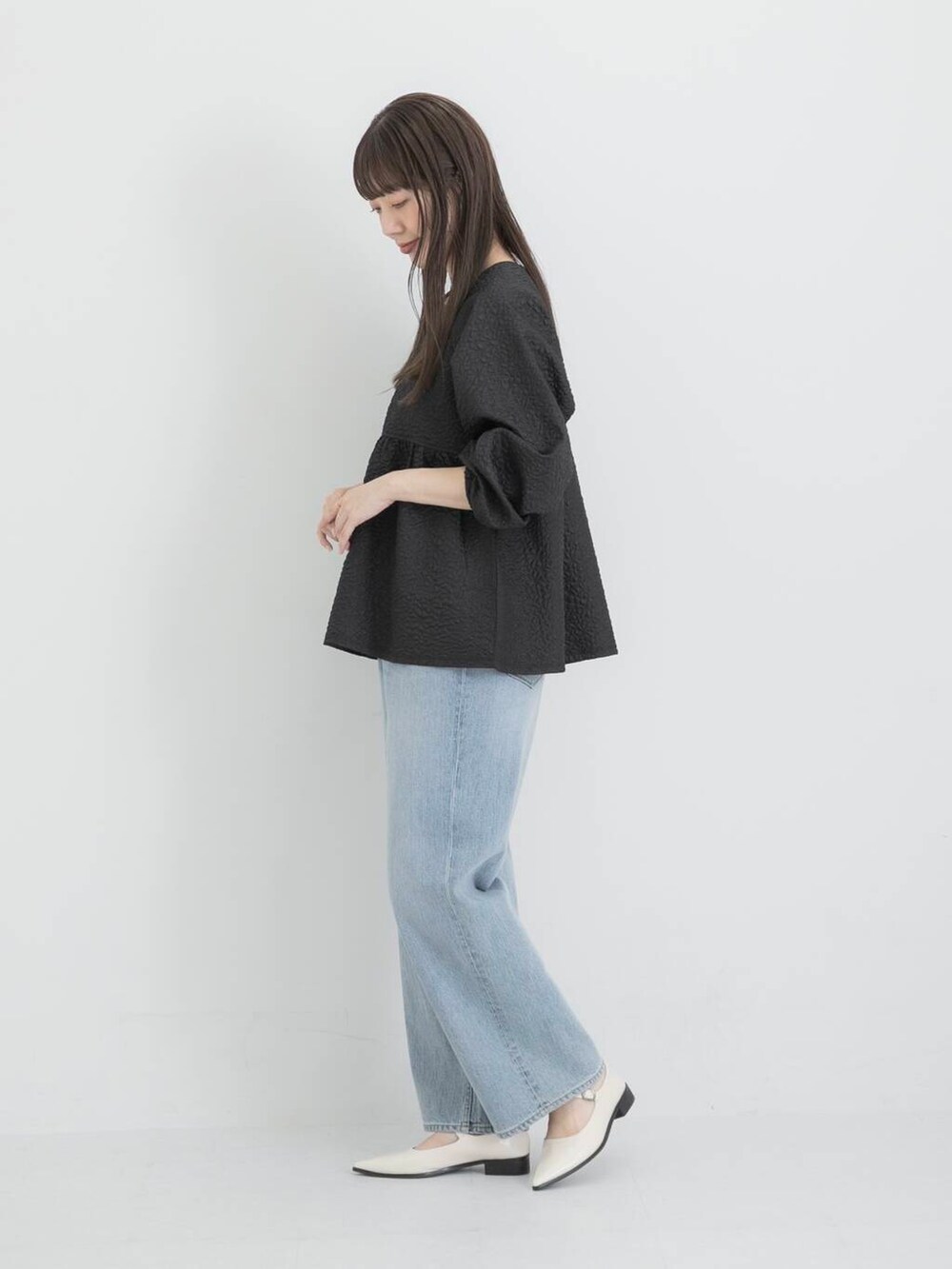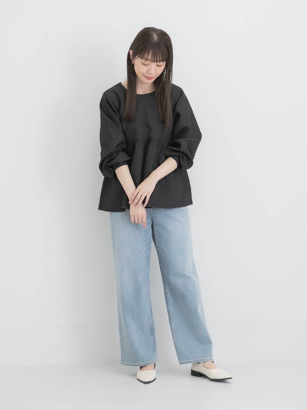 立体感のあるジャガード素材とペプラムシルエットで