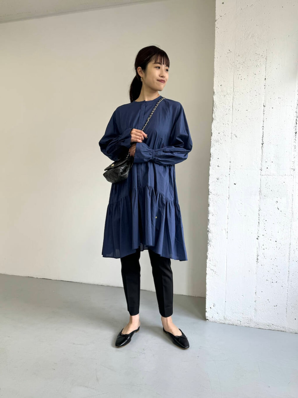 パンツとのレイヤードは、すっきりとしたスティックパンツやテーパードパンツとの
