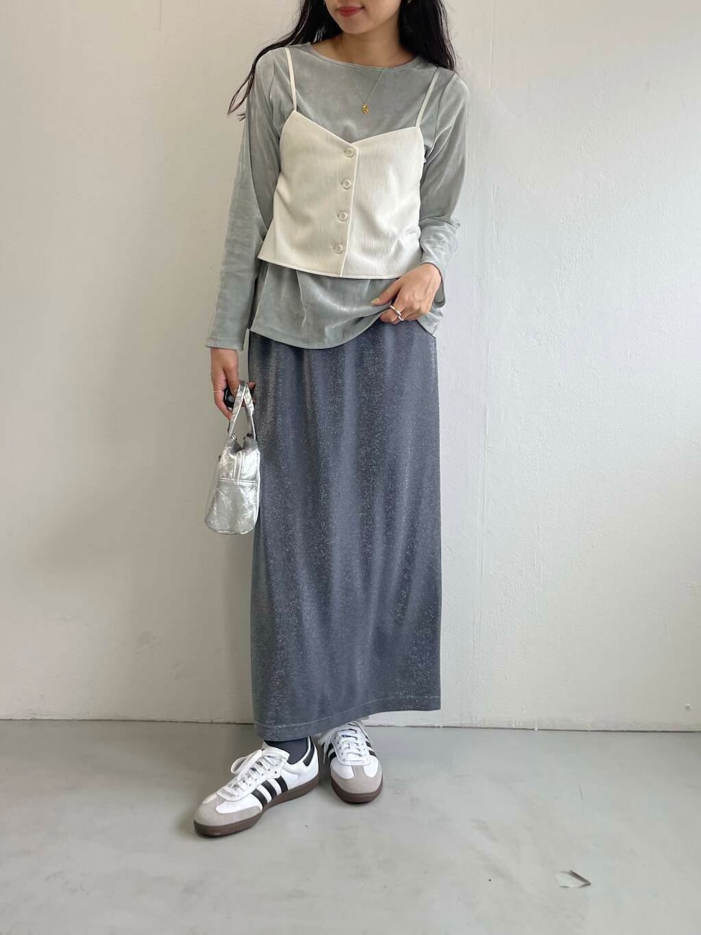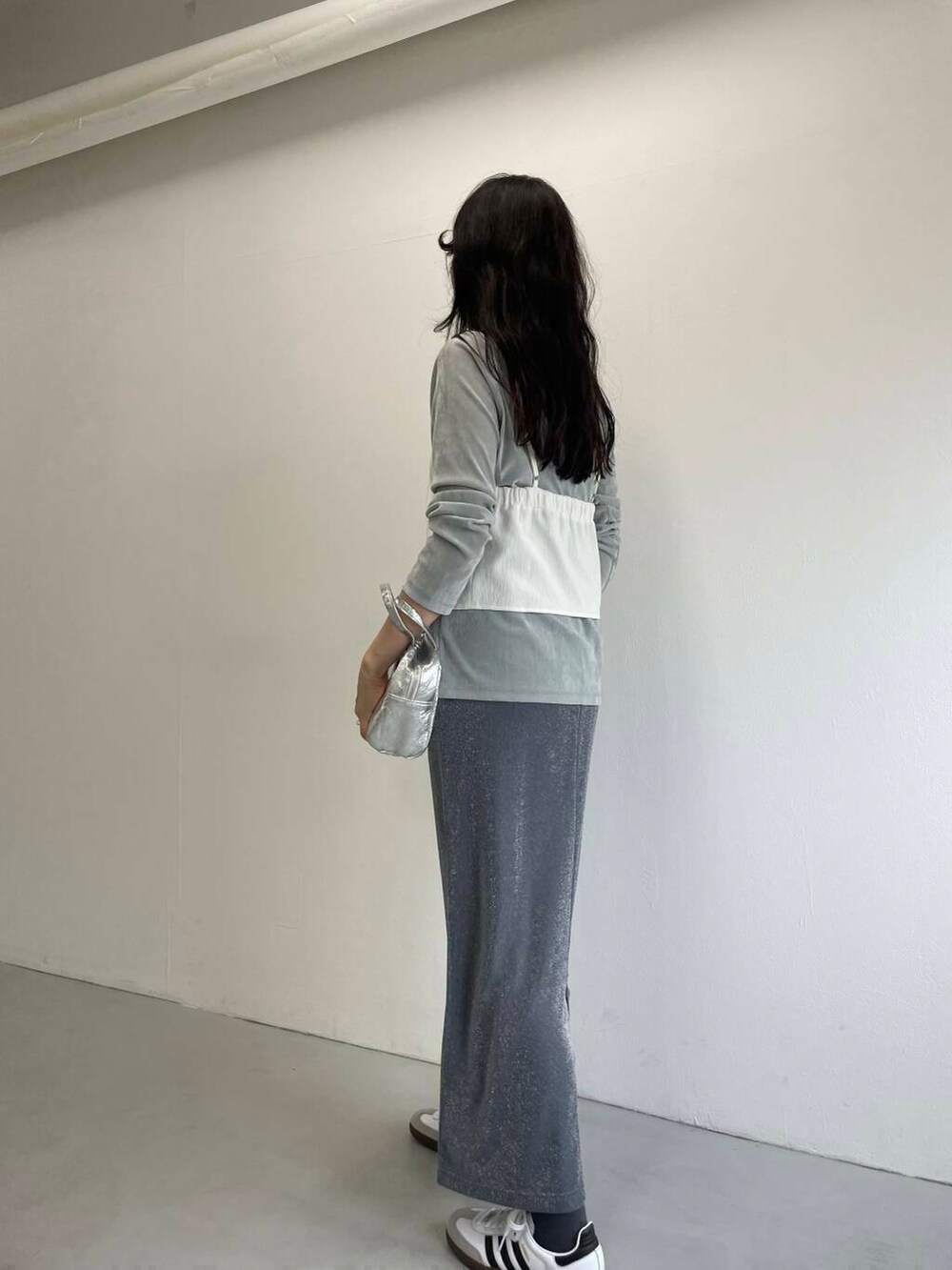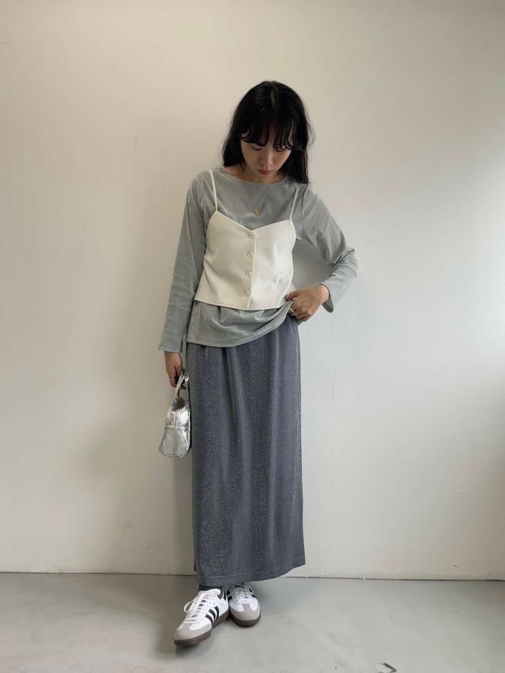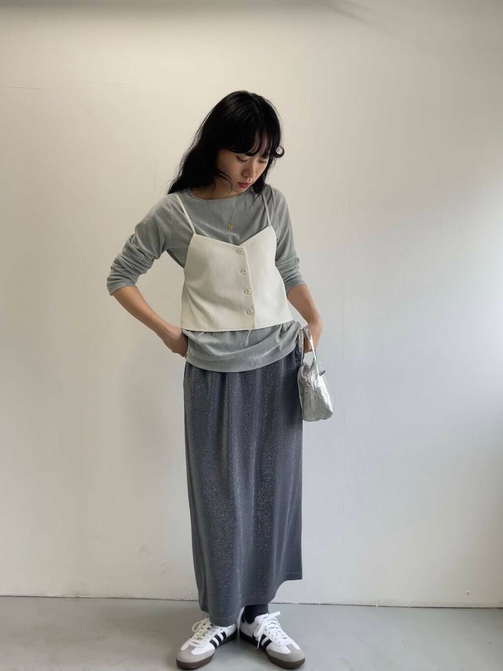 ベロアカットソーとラメスカートで華やかさもプラスしながら、ドレッシーになりすぎないよう足元はスニーカーでカジュアルダウンさせました。