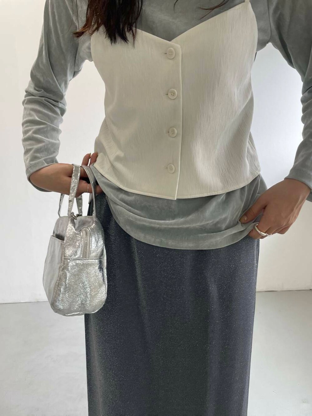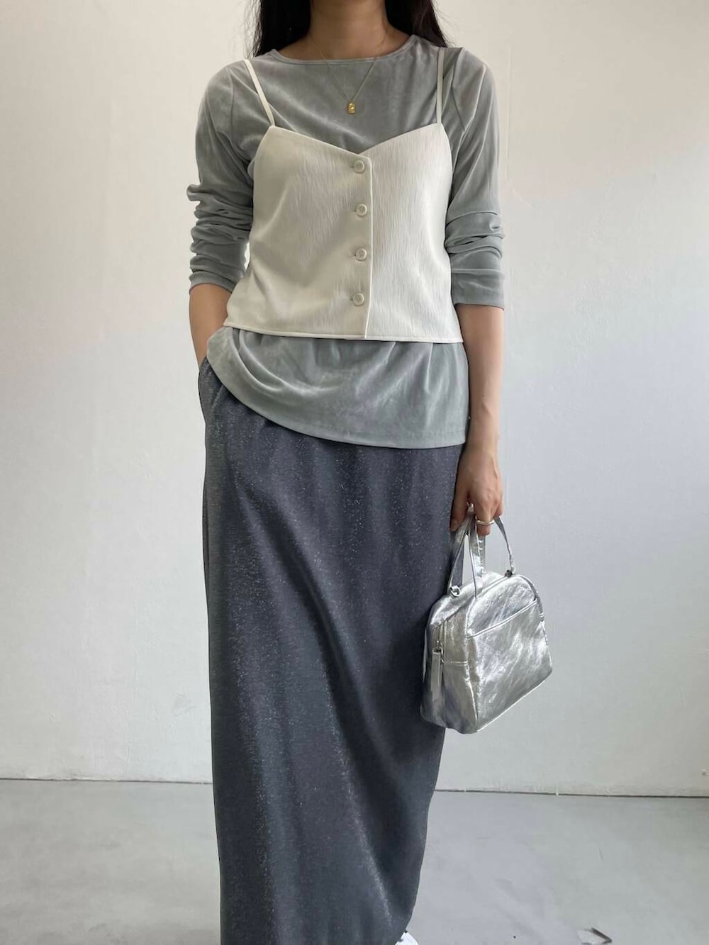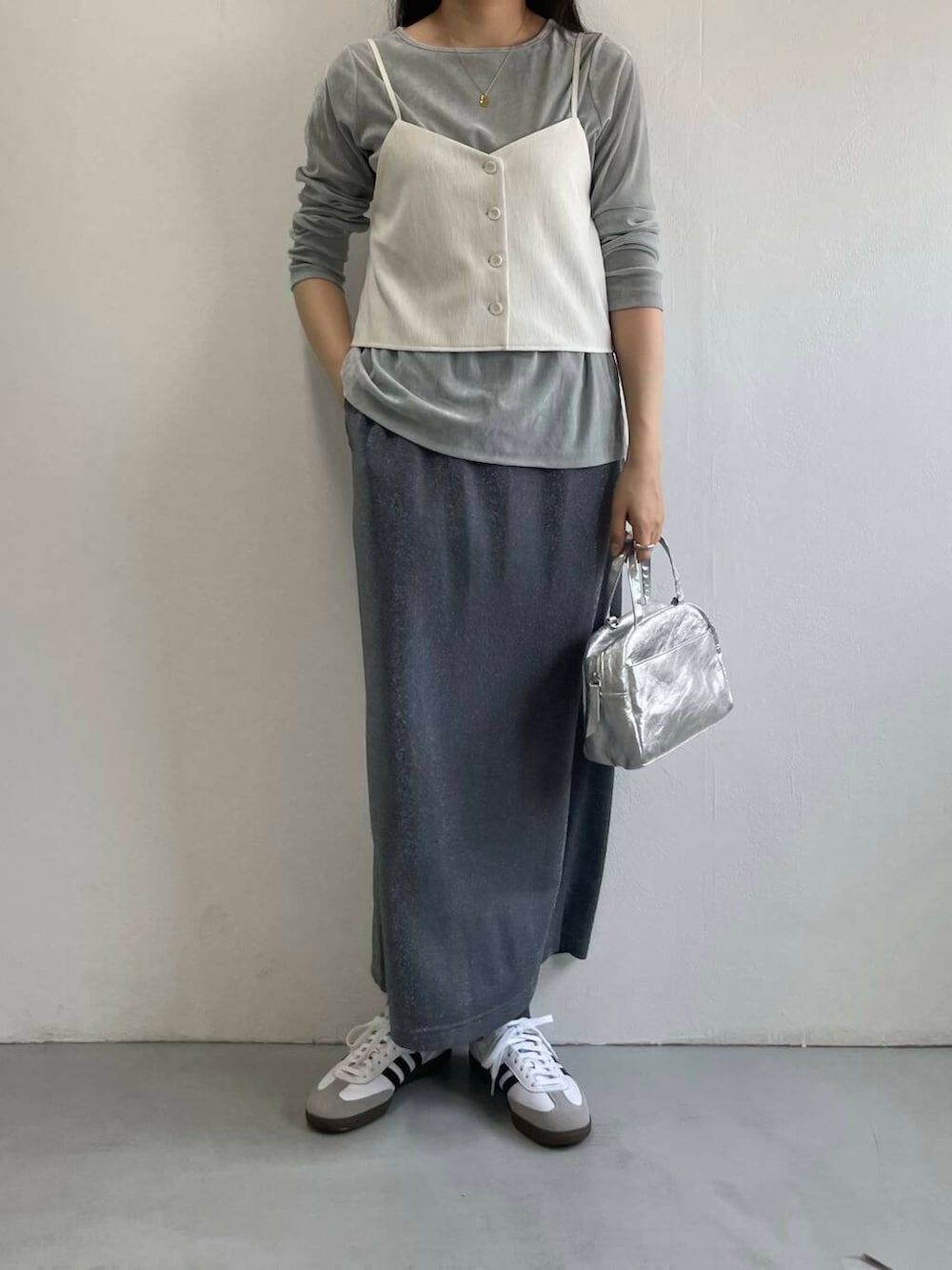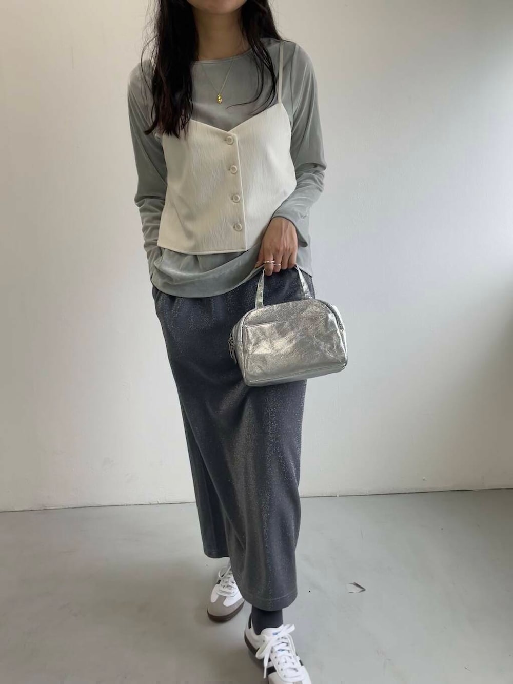 ベロアカットソーとラメスカートで華やかさもプラスしながら、ドレッシーになりすぎないよう足元はスニーカーでカジュアルダウンさせました。