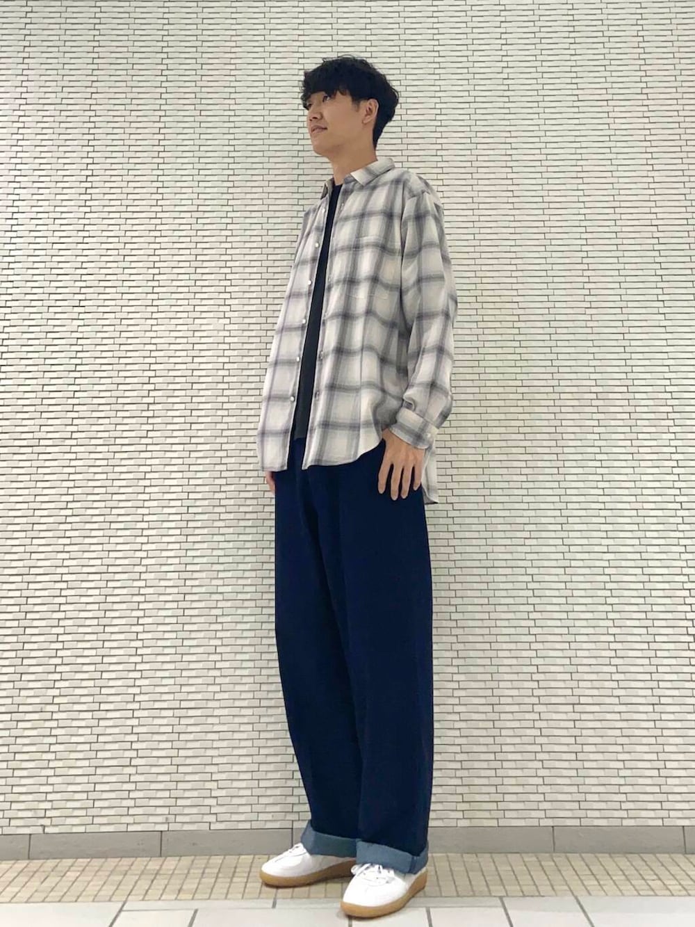 チェックシャツを羽織った秋のカジュアルコーディネートです。
