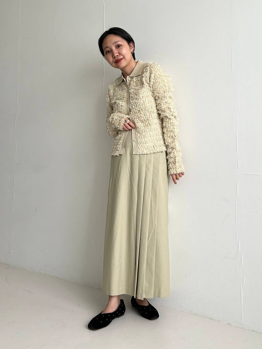 ボタンを開けたり、ボトムにインしたり、裾の変化で様々な形のボトムで合わせていただけますよ☺️