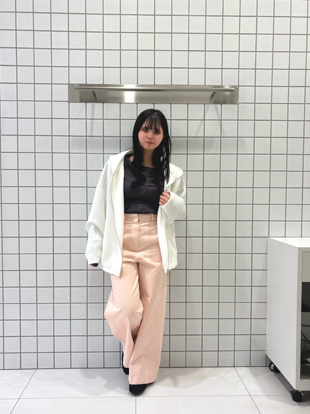 ジャケットは短丈でさらっと羽織りやすく、ブラックのセットアップでありがちな重い印象になりづらいです〇