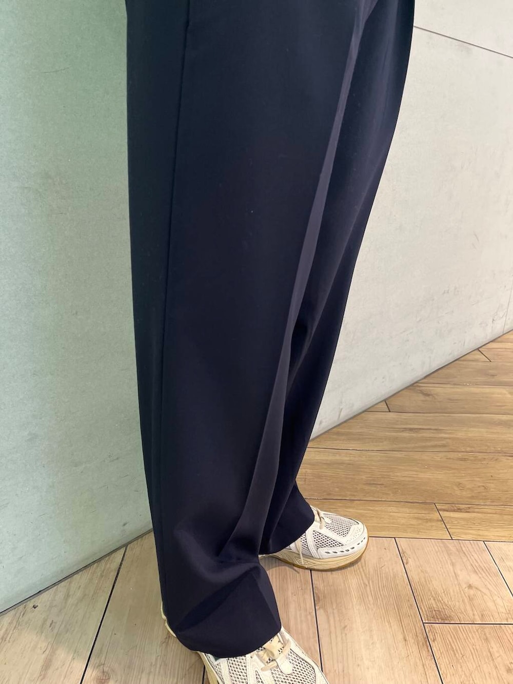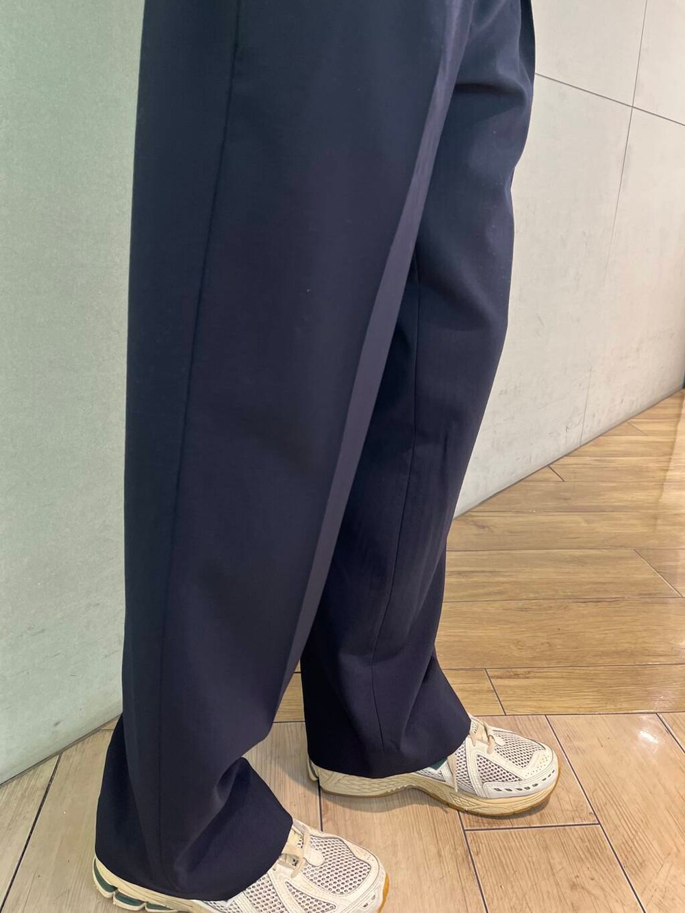 スラックスで大人っぽさ出しつつも、スニーカーでラフなお出かけコーデに!!