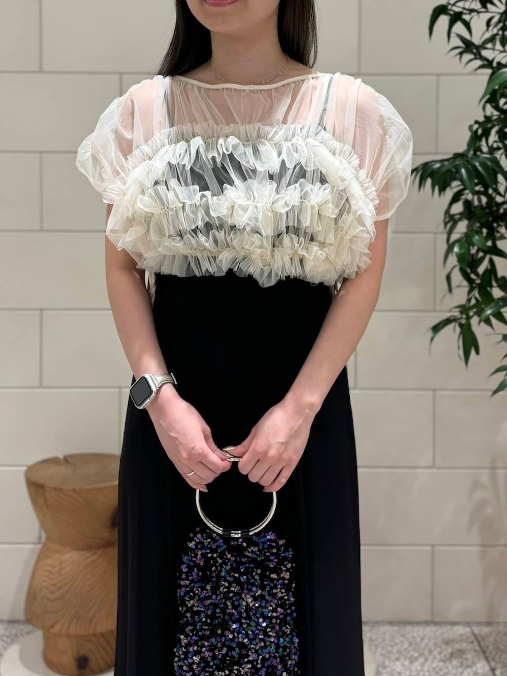 クロップド丈でレイヤードスタイリングが楽しめます。サイズ感がタイトなので締まりのあるシルエットになります。