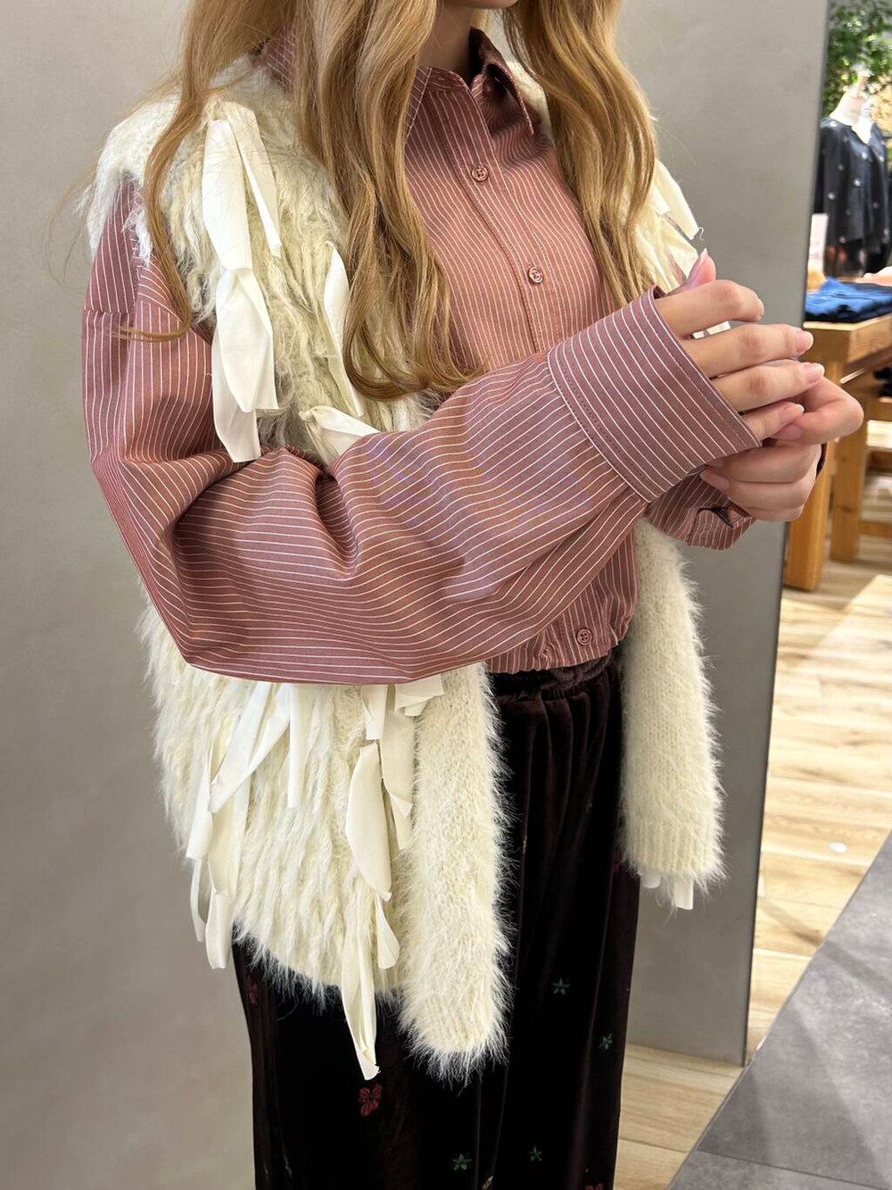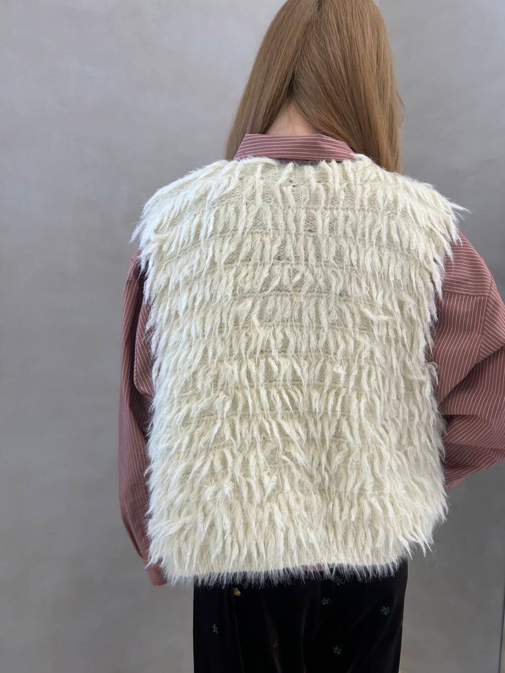 ジャギーニットリボンベストは、表から見ると一癖あるデザインになっているので、自分なりに着回しをすることで、自分らしさを演出することが出来ます!!