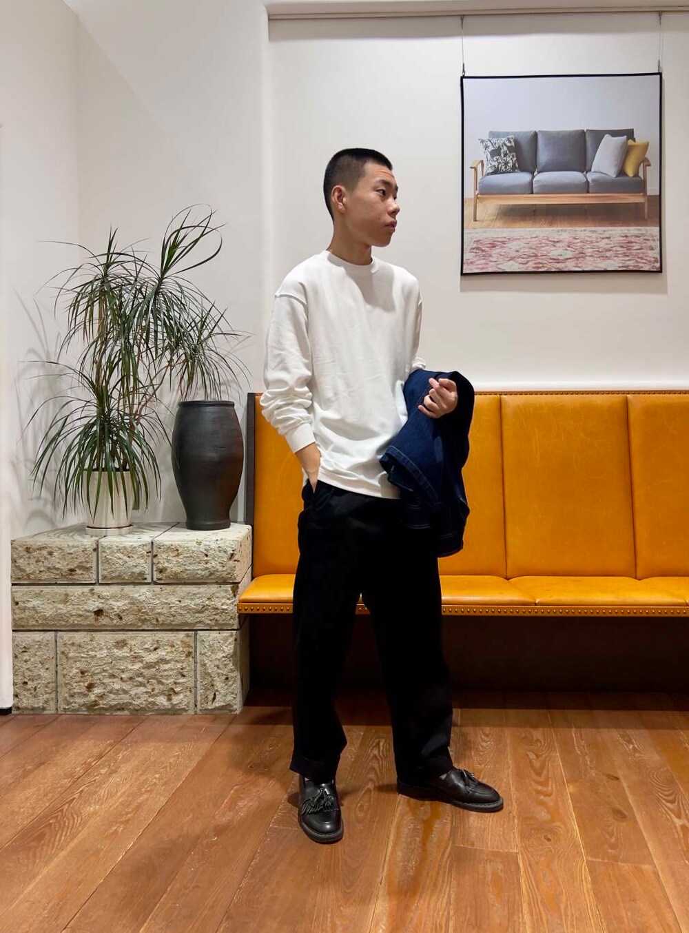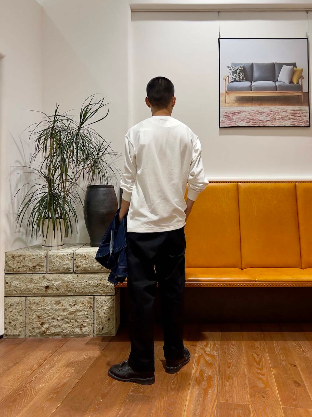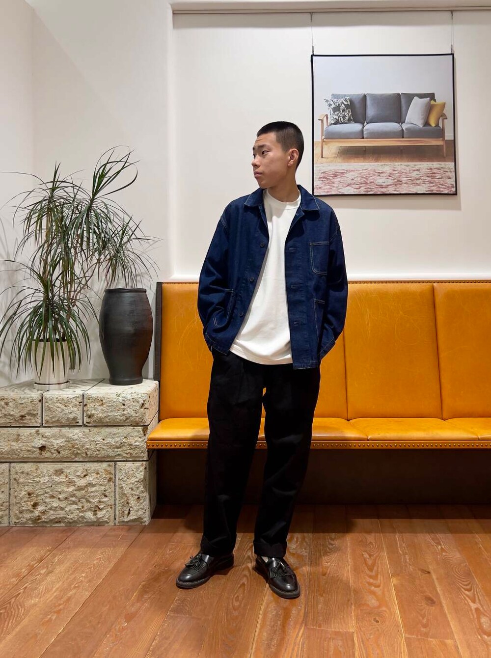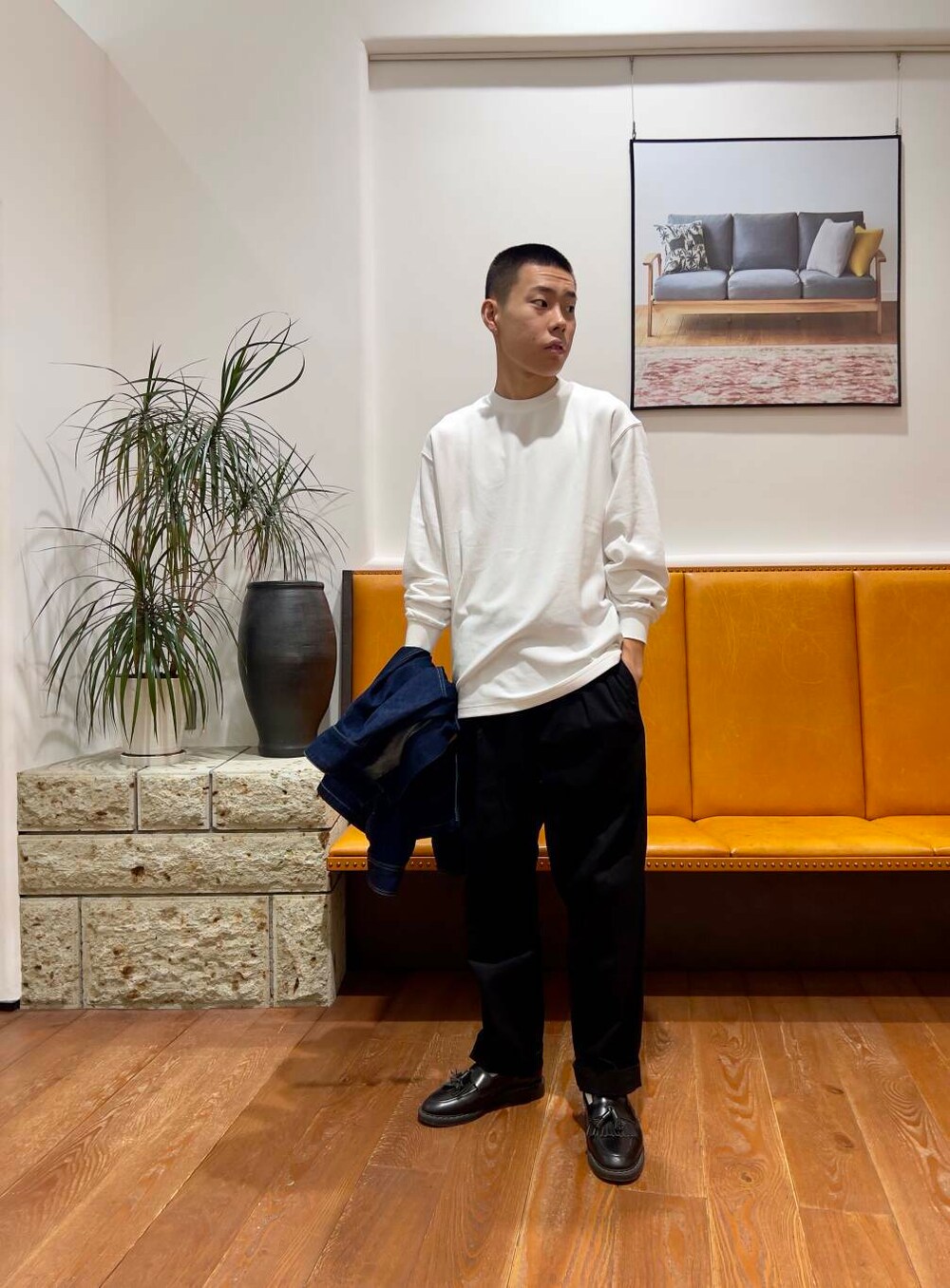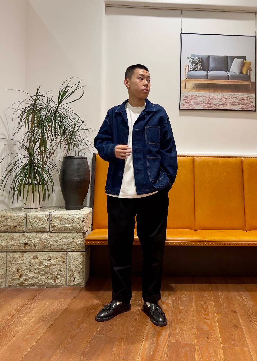 インナーのgrow organicはゆとりのあるボックスシルエットなので屋内などでジャケットを脱いでTシャツだけでも様になります。