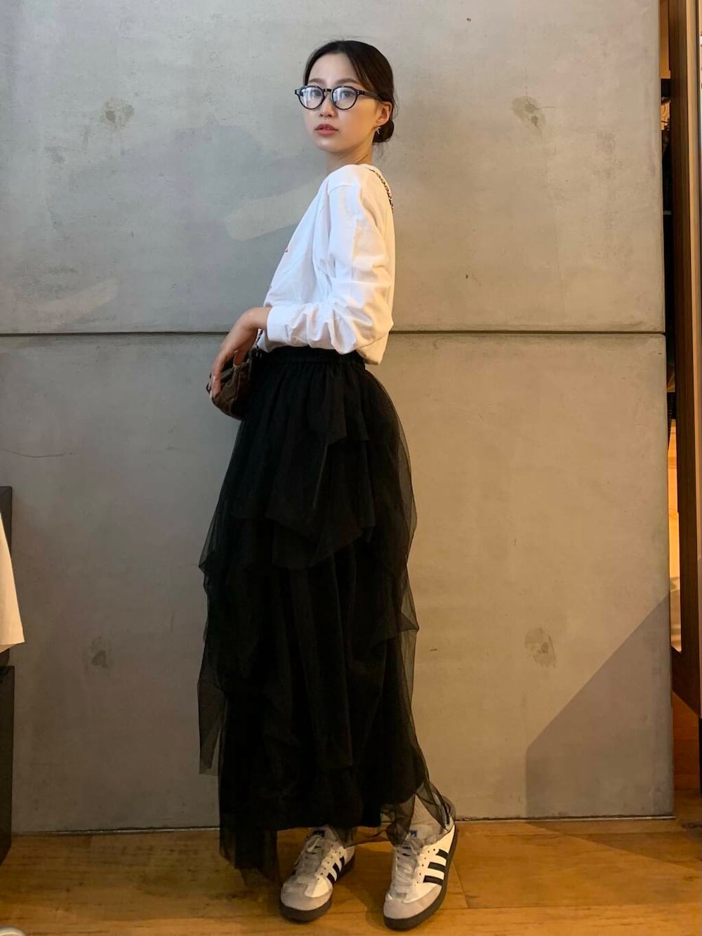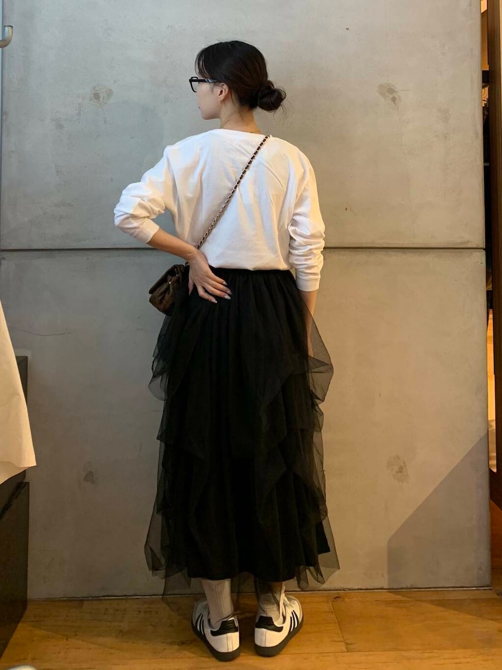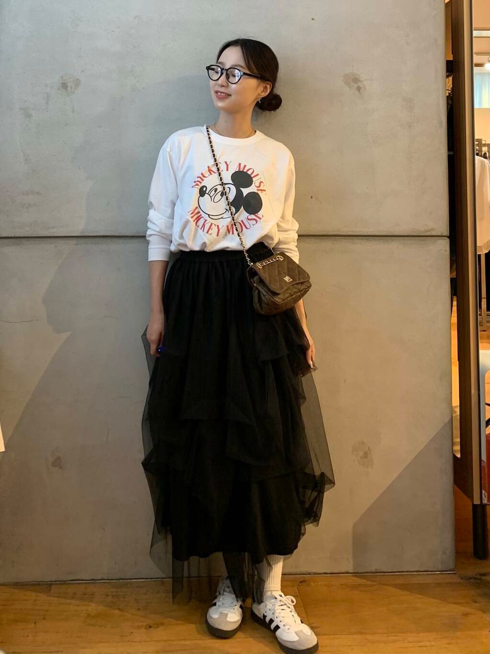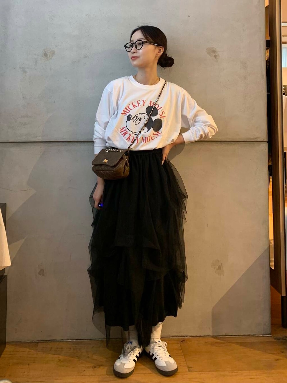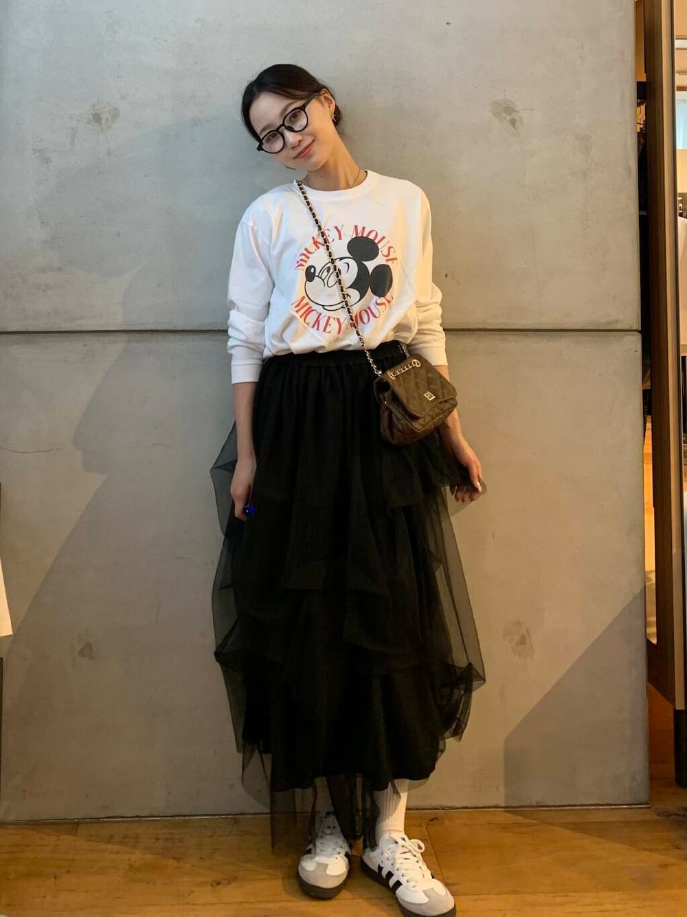 ミッキーのロンTは結構シンプルなデザインなので、ボトムはデザイン性の高いチュールのものを選びました!😌