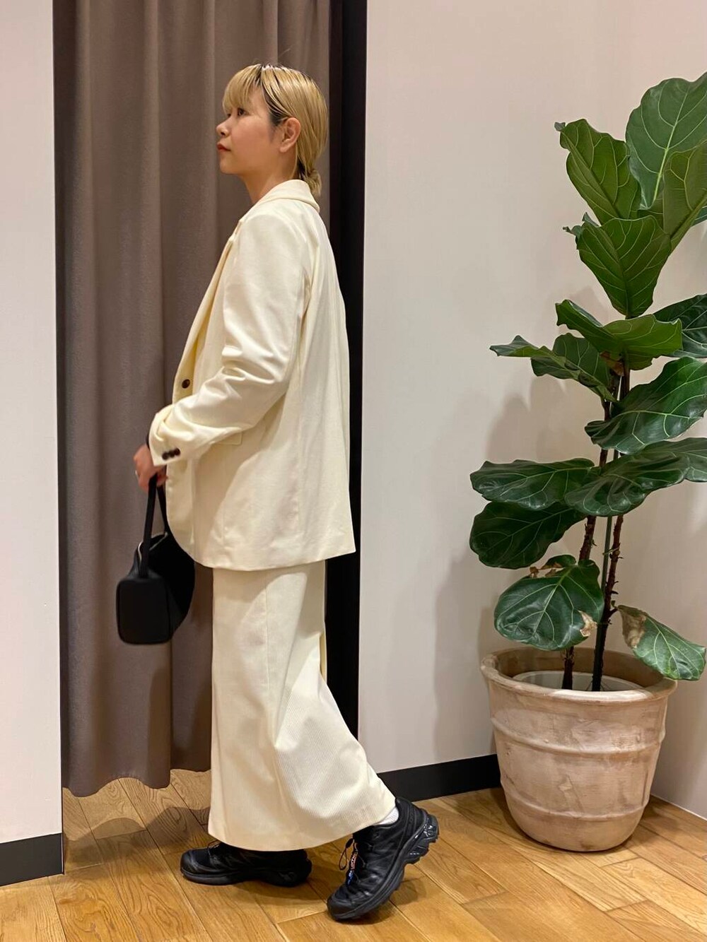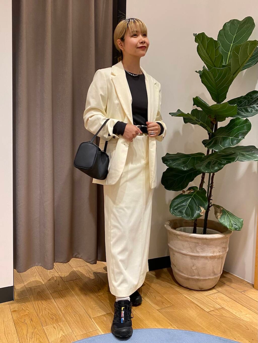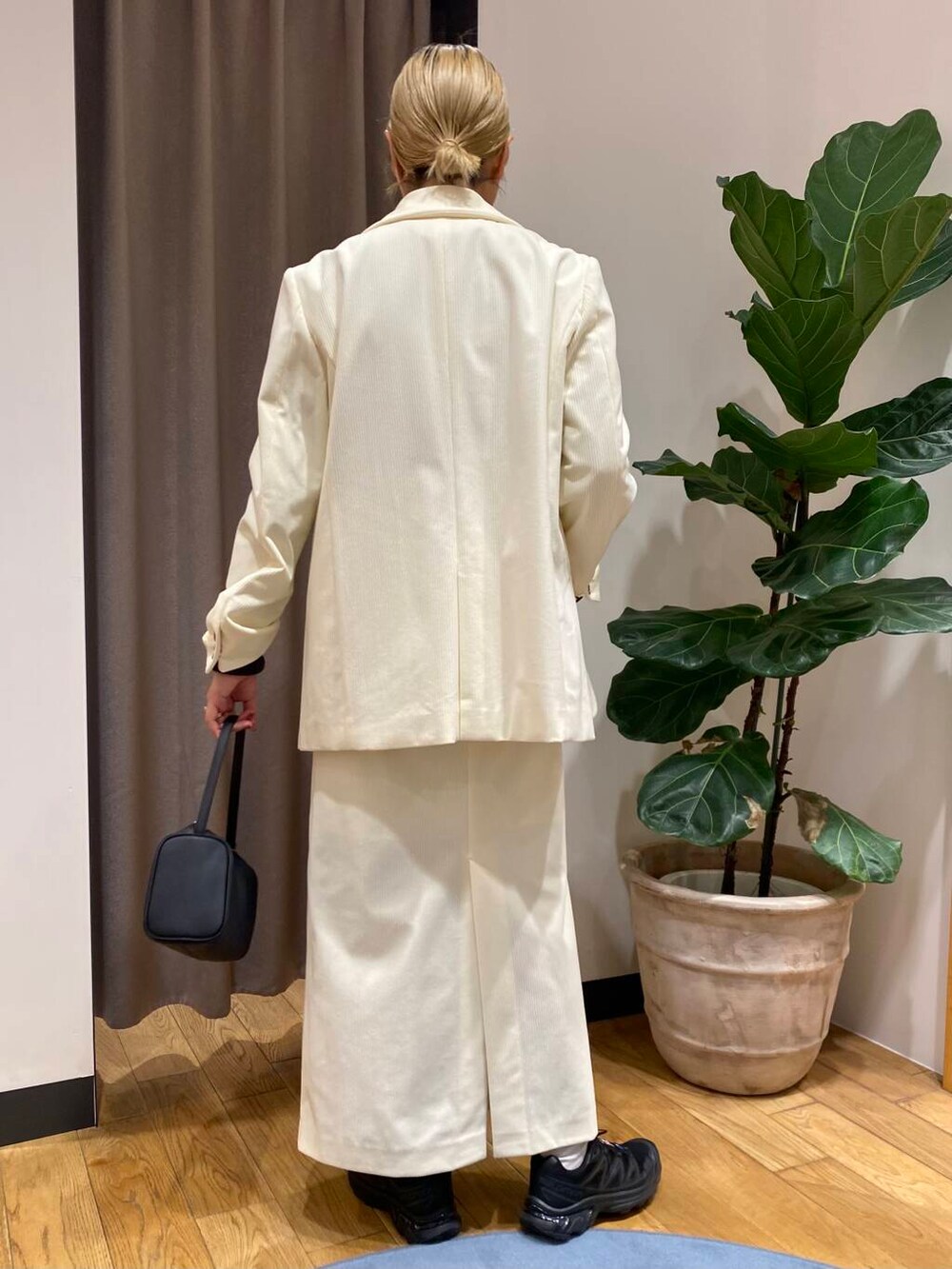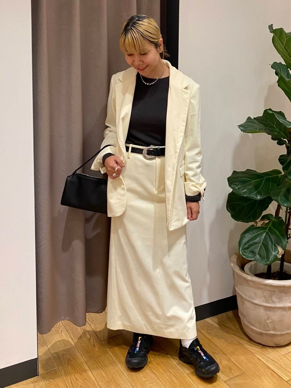 ホワイトのジャケットは、他のアイテムのカラーをダークトーンで揃えると落ち着きます☺️