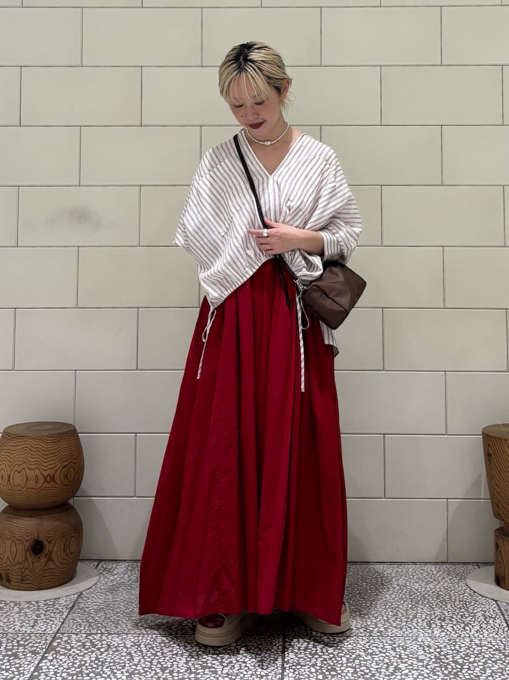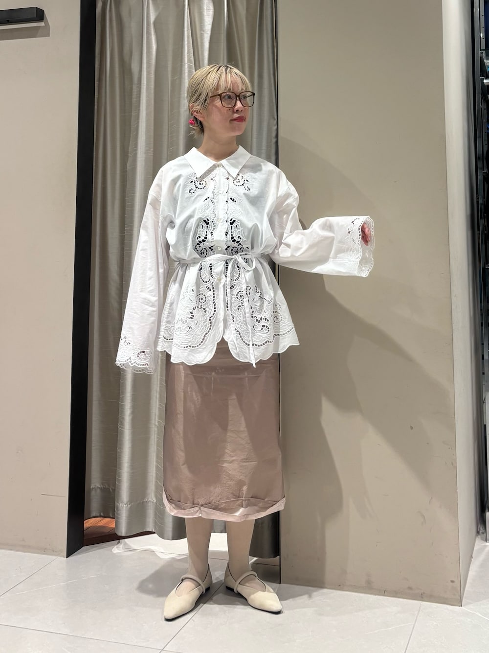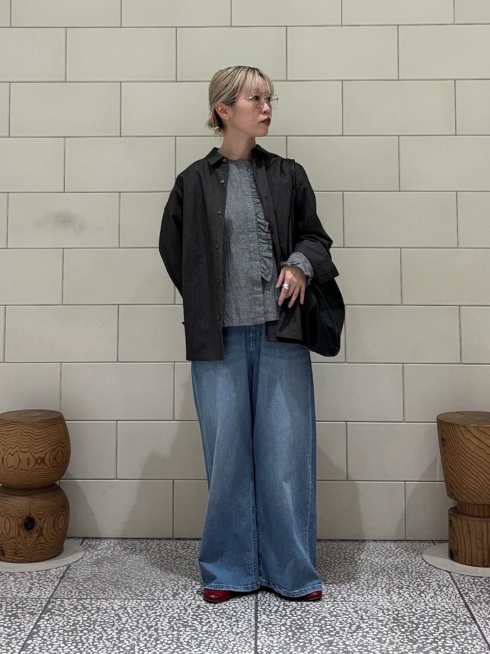 155cmでの着用サイズ感です。ウエスト部分絞れるのでシルエットお好みで調整していただけます。