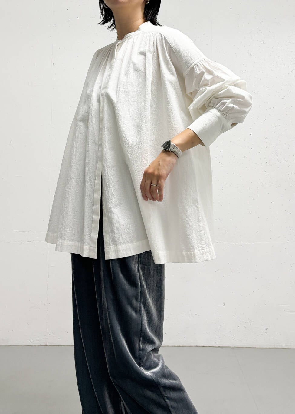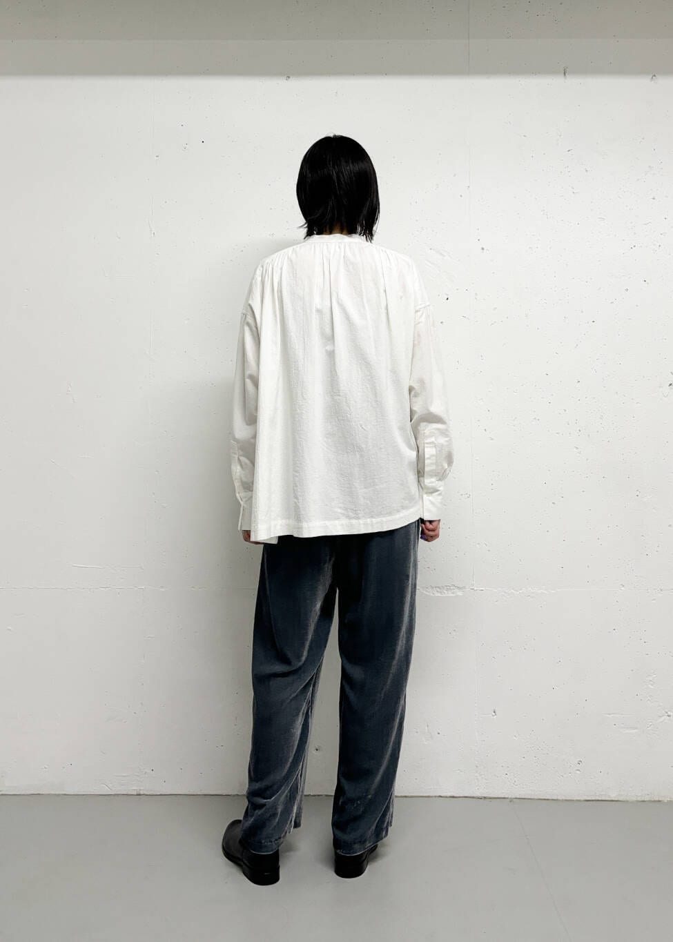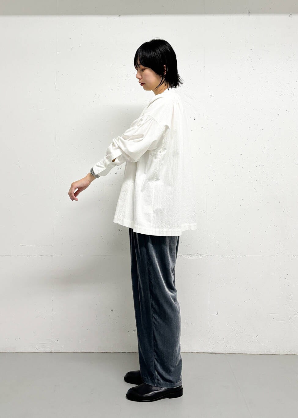 たっぷりのギャザーやヴィンテージ風のディテールを取り入れたりと、シンプルに見えてこだわりが詰まったブラウスにベルベットのパンツを合わせました。