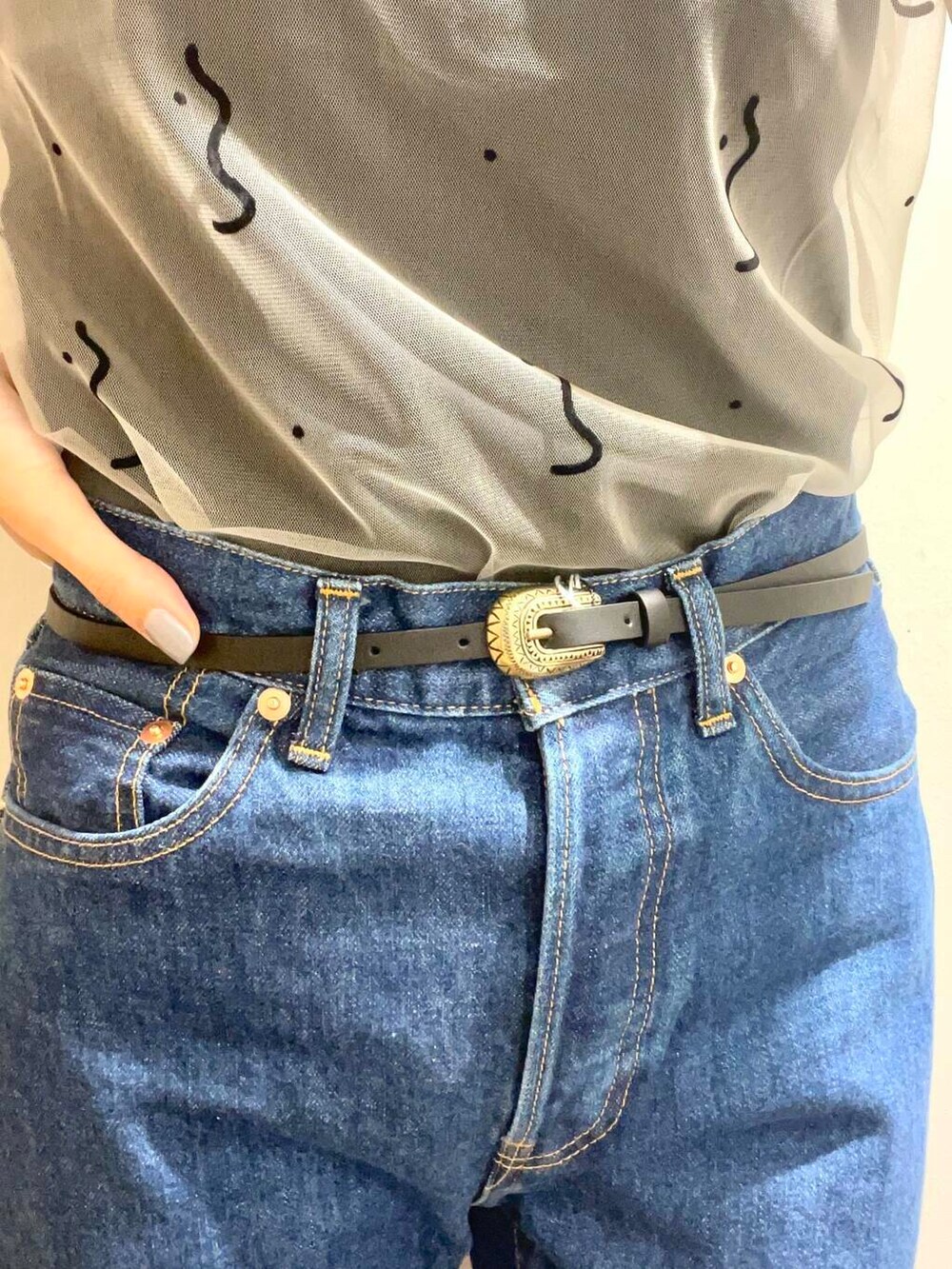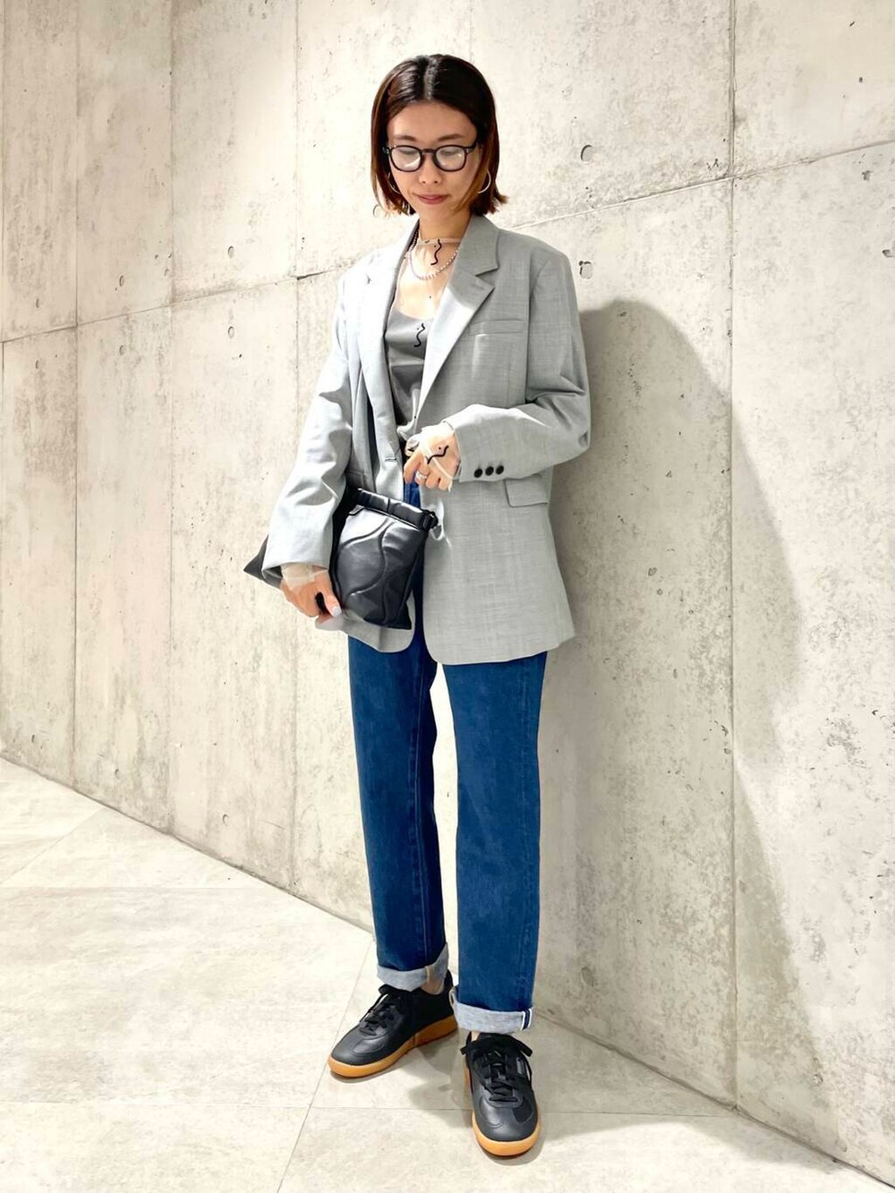 なみなみ模様がポイントのシアートップスにストレートデニムを合わせて、かっちりジャケットでマニッシュなスタイルです。