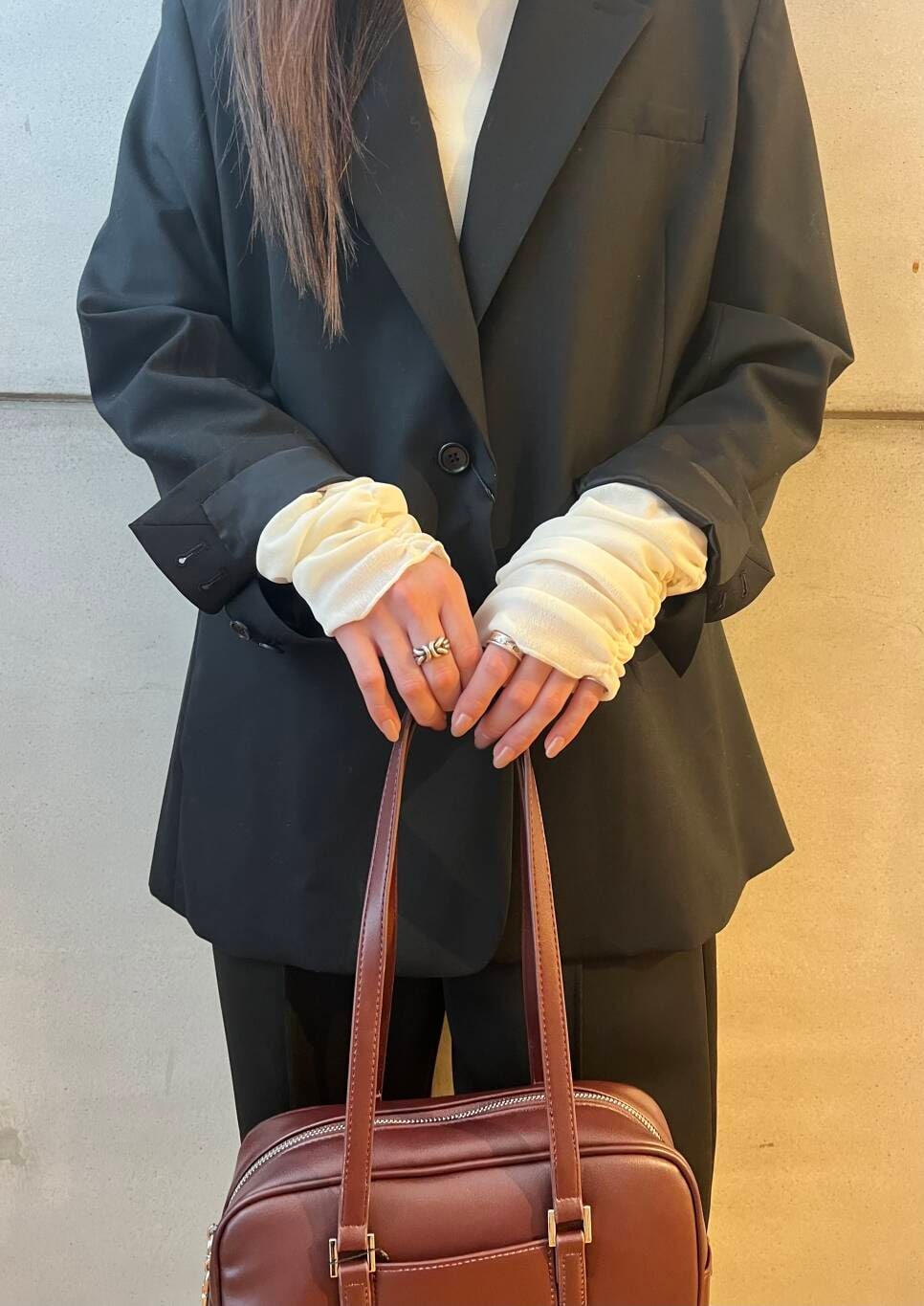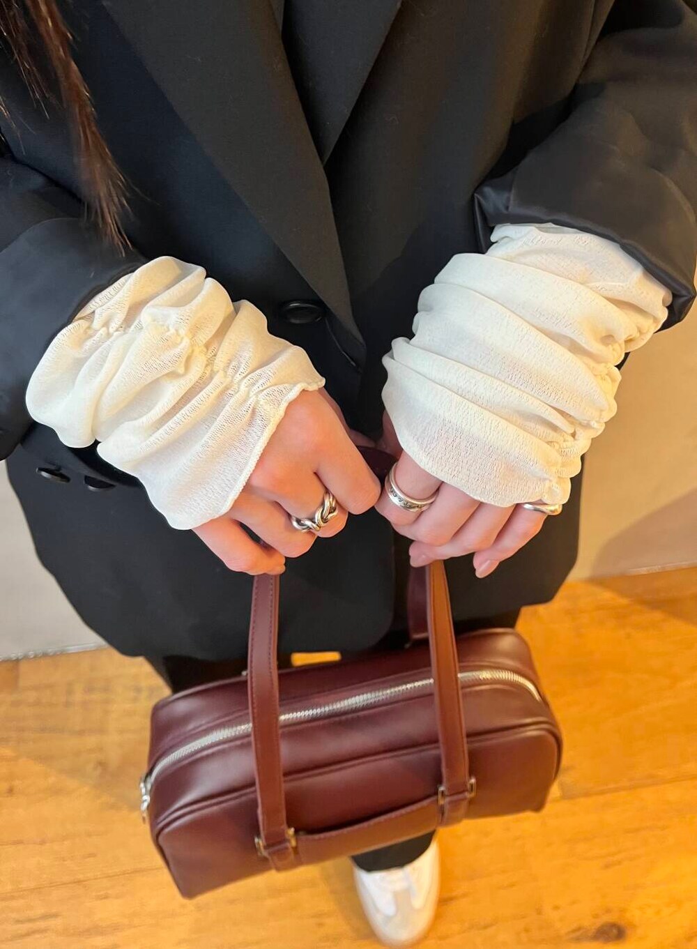 中に着ているベロアのトップスは、シアーで透け感があり、袖がシャーリングになっており、アウターから少し出すとポイントになり、可愛く着こなしていただけます💖