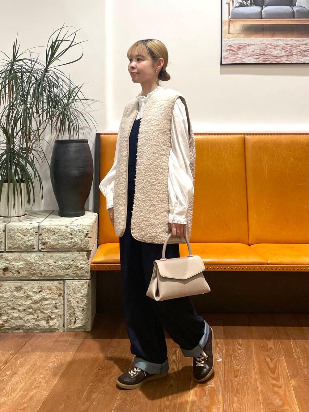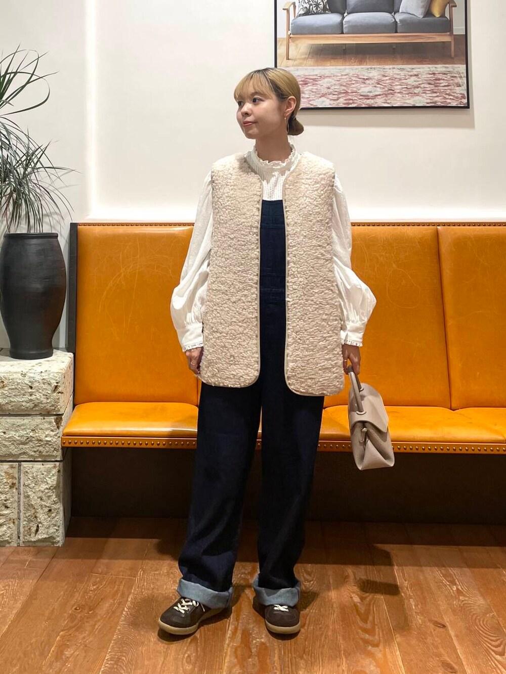 サロペットはデニム素材でカジュアルなアイテムですがブラウス合わせをすることで女性らしい雰囲気でも着て頂けます◎