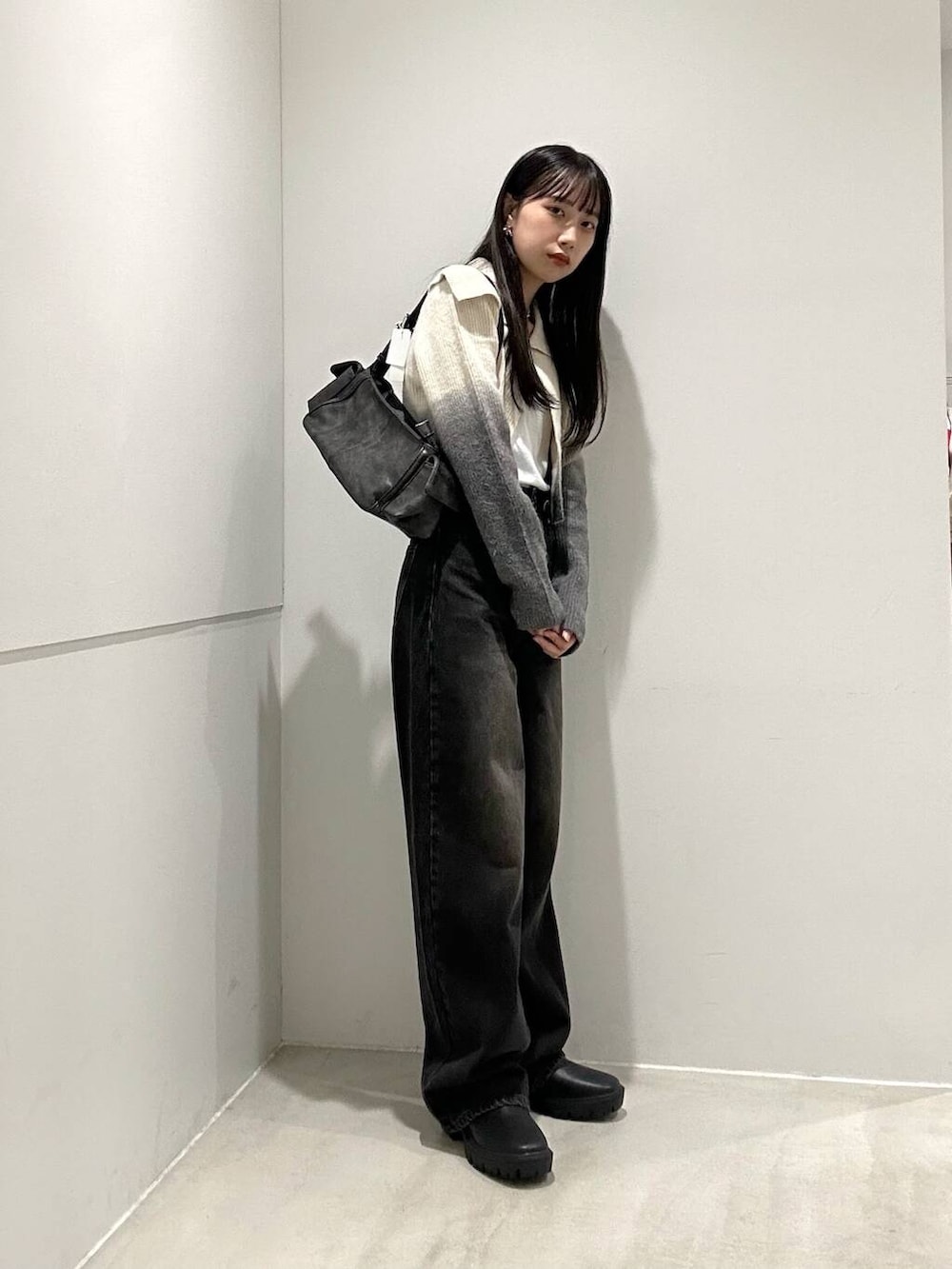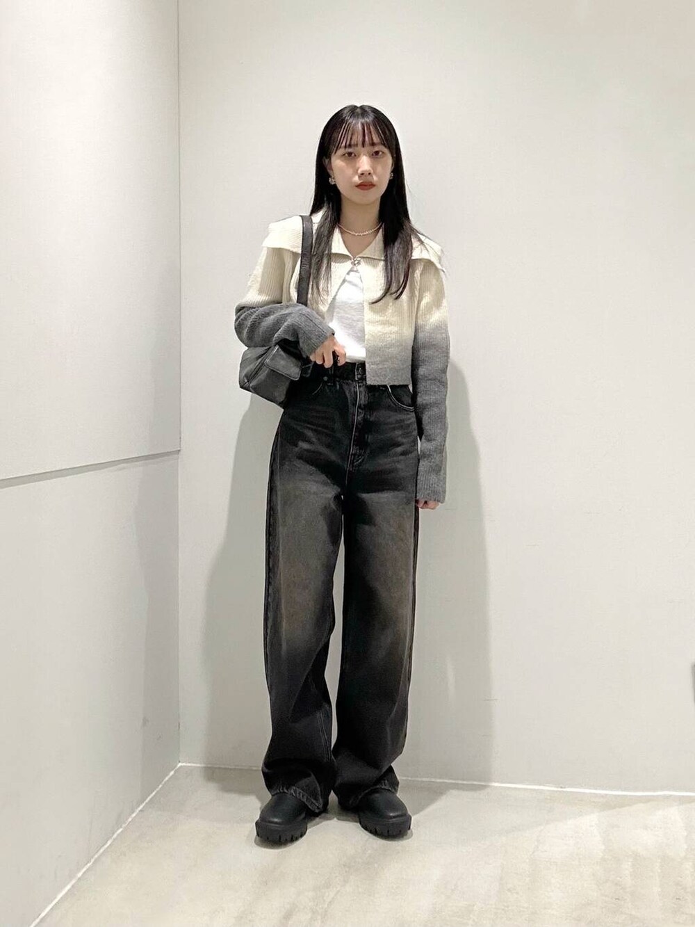 今回着用のニットはシルバーの金具と大きめの襟がポイントです!