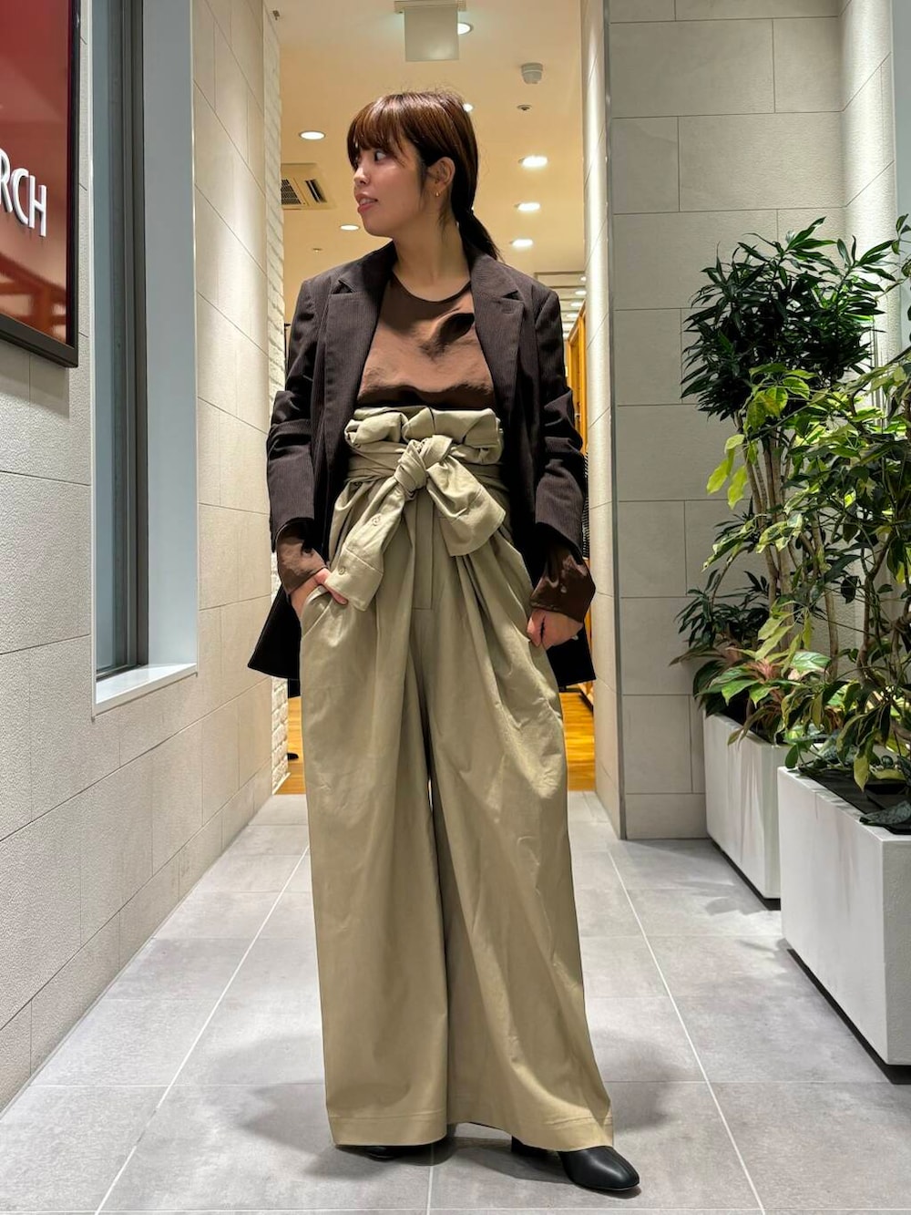 コーデュロイの素材と艶感のあるサテン素材を合わせるのもおすすめです♬