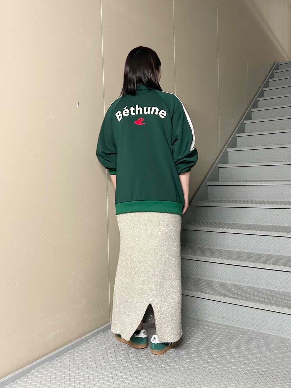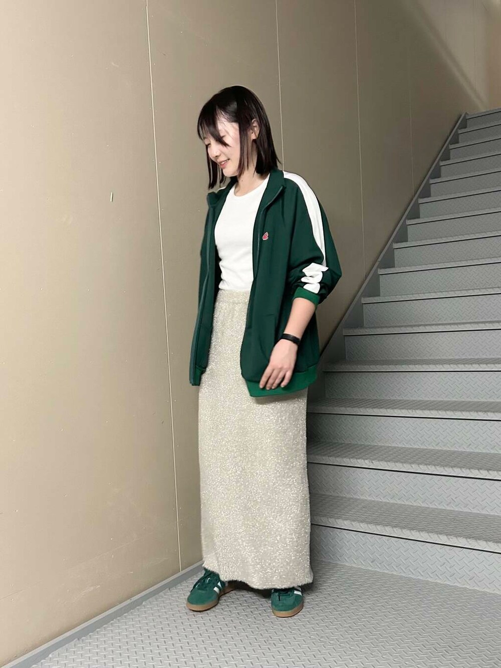 ジャージとスニーカーは緑統一感を出しつつ、カジュアルにまとめました✨