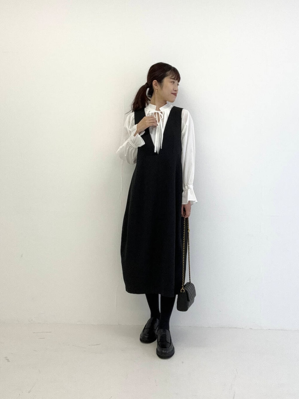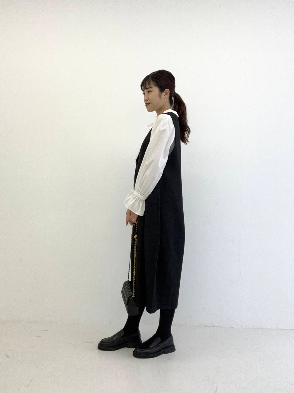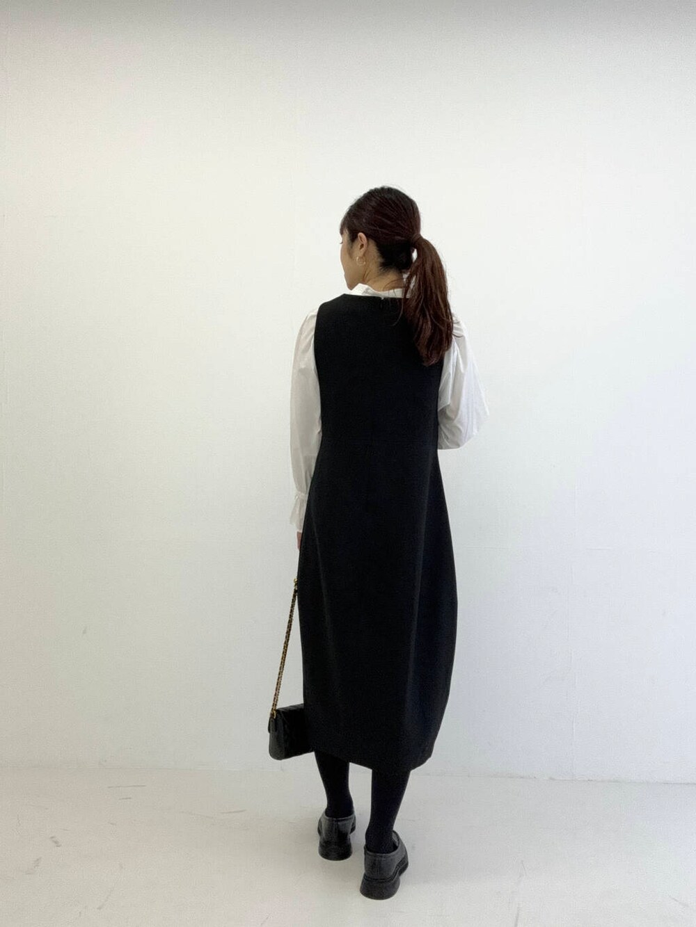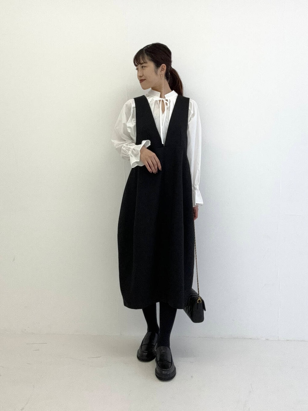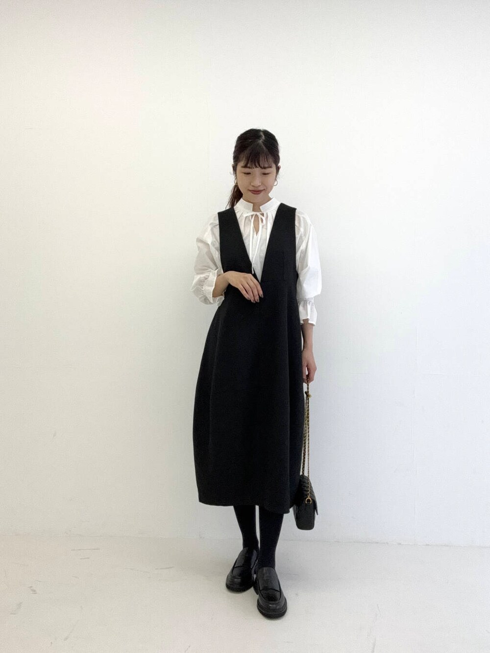今の時期だとブラウスやカットソーと、肌寒くなったらハイネックニットと合わせたい一着です。