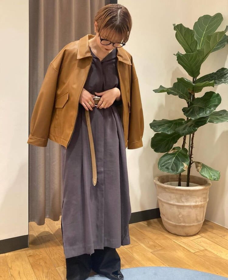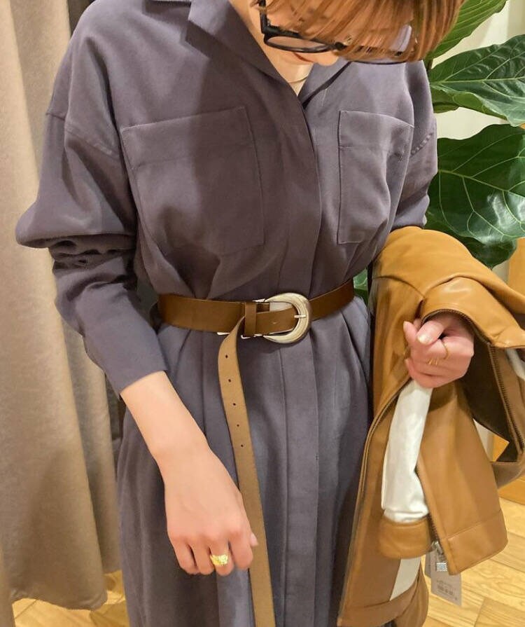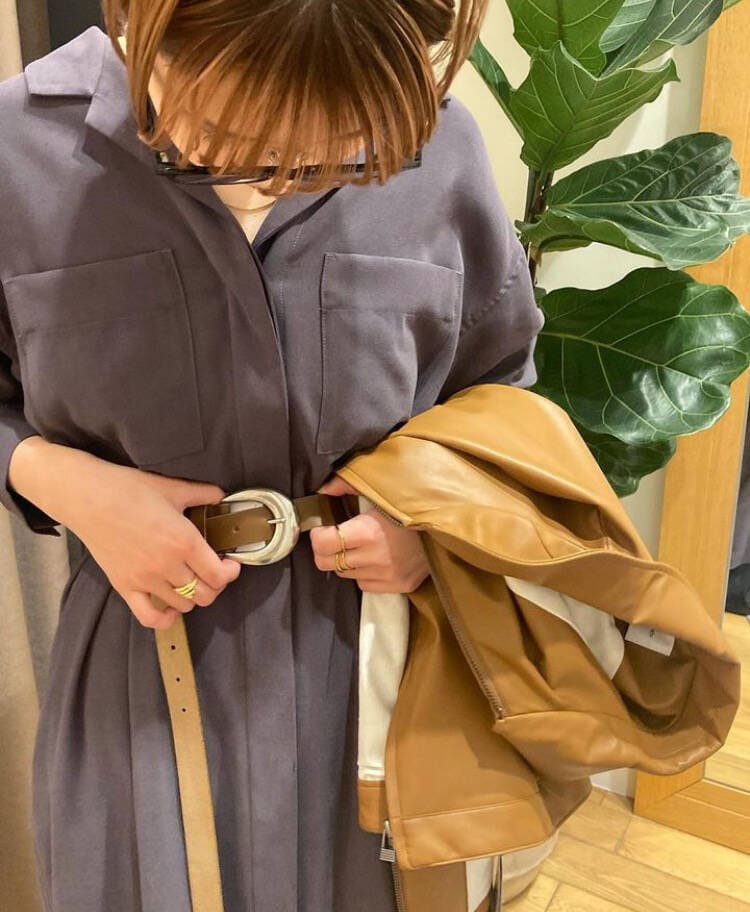 カラーが全体的に落ち着いた大人の印象なのでキャメルカラーのベルトやレザーライクジップブルゾンを合わせ、重くなり過ぎないようにしてみました🤎