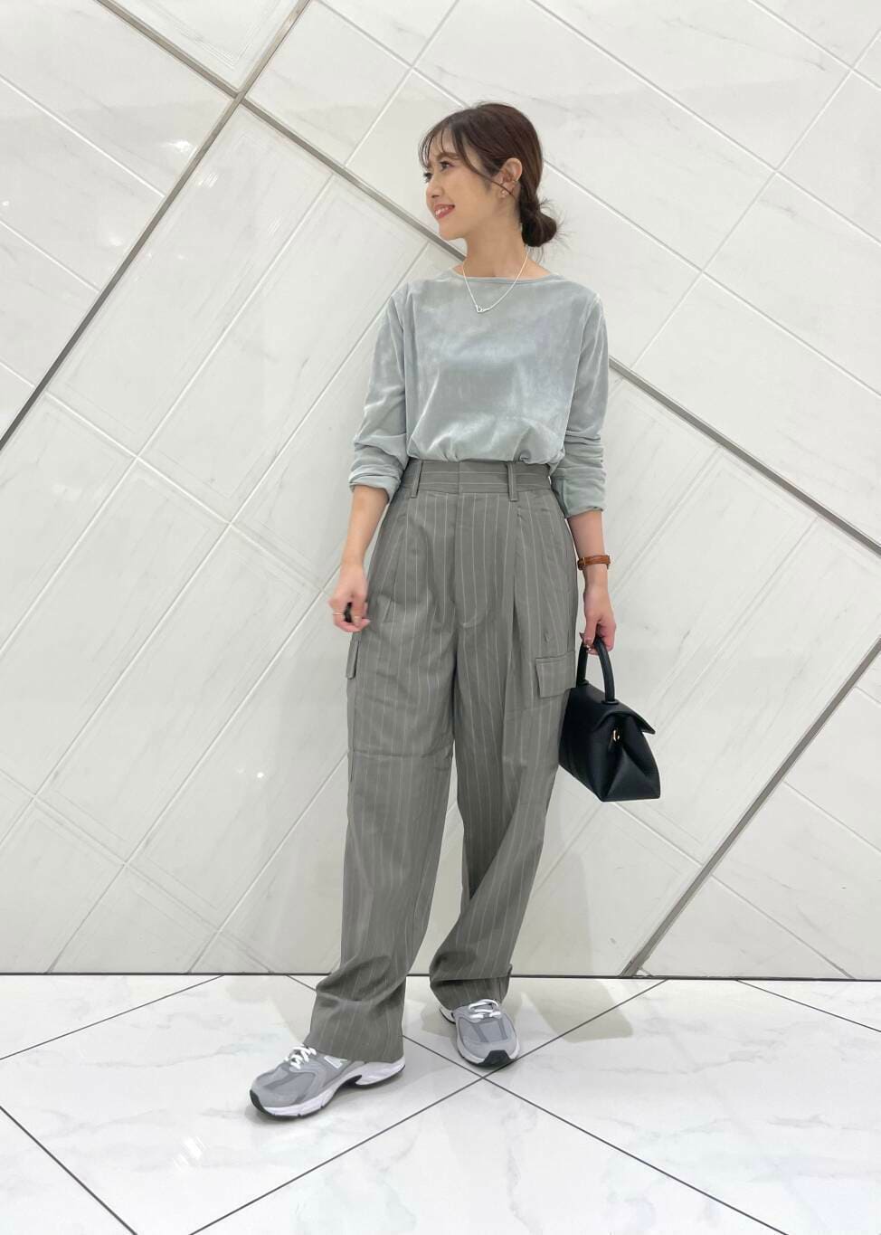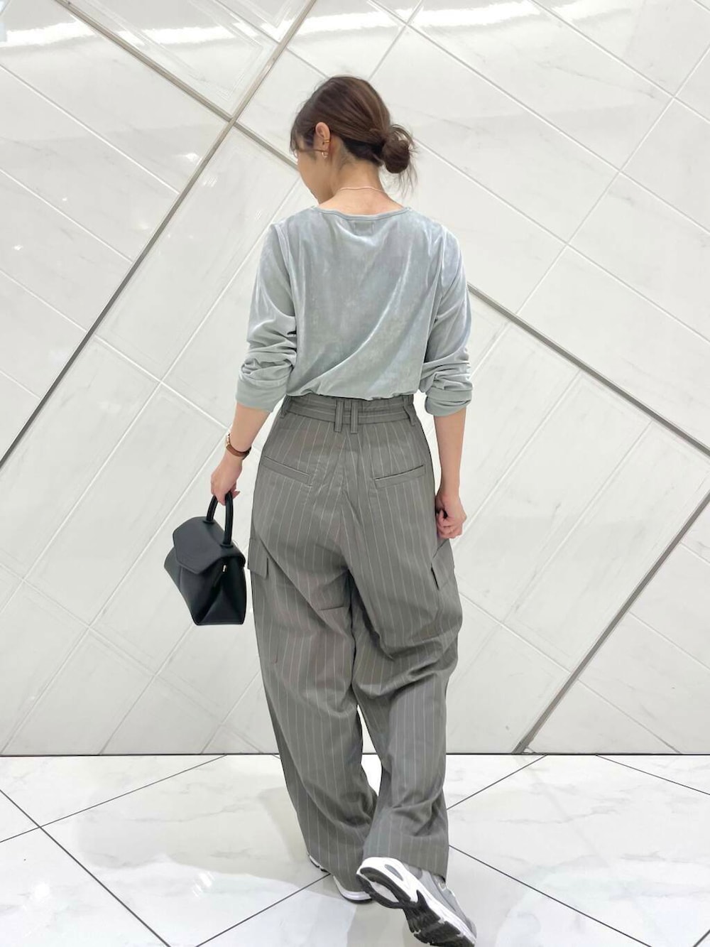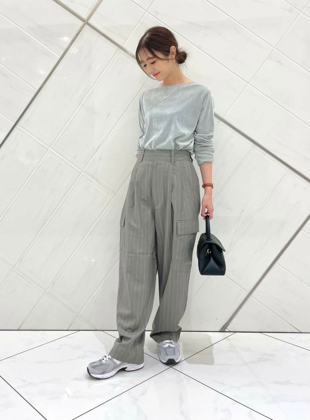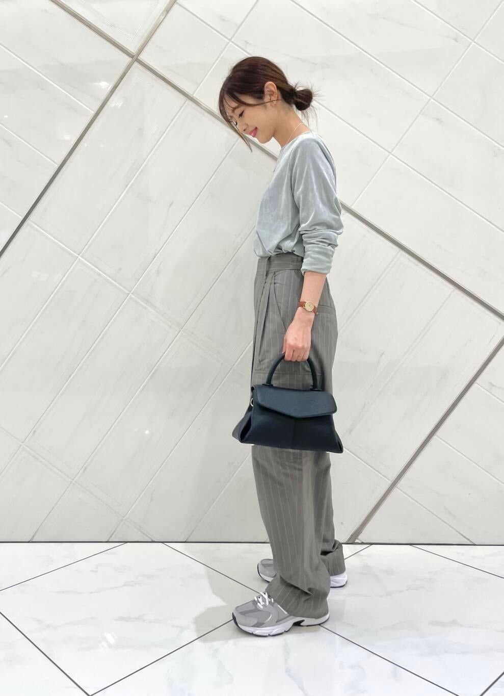 トップスは薄手でややシアー感のあるベロア素材でそこまで肌感は分からないのでシアートップスに抵抗がある方でも取り入れていただきやすいと思います(^^)