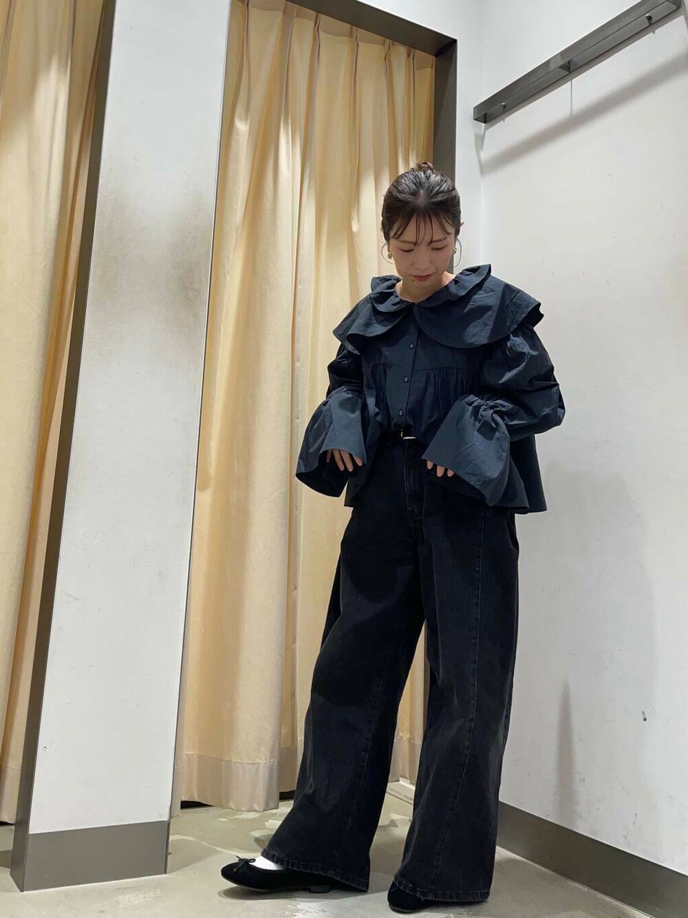 一枚で華やかに着れるブラウスなので、トップスを主役にリアルバイしたタックデニムと合わせてワントーンコーデにしました◎