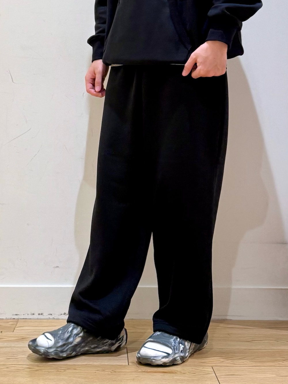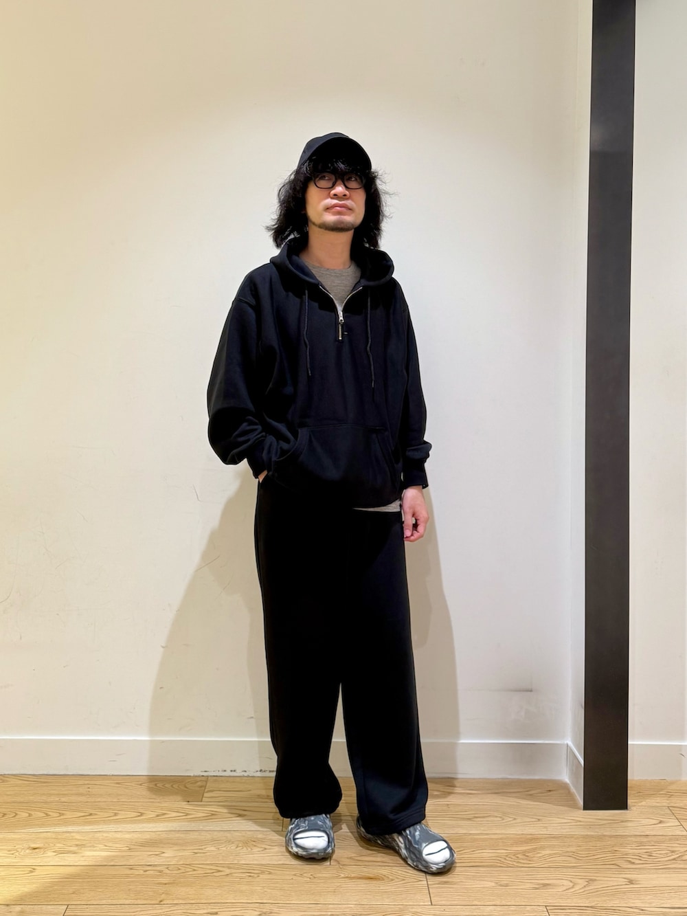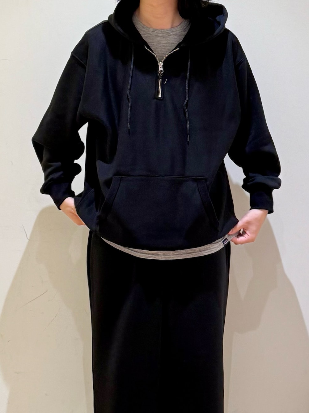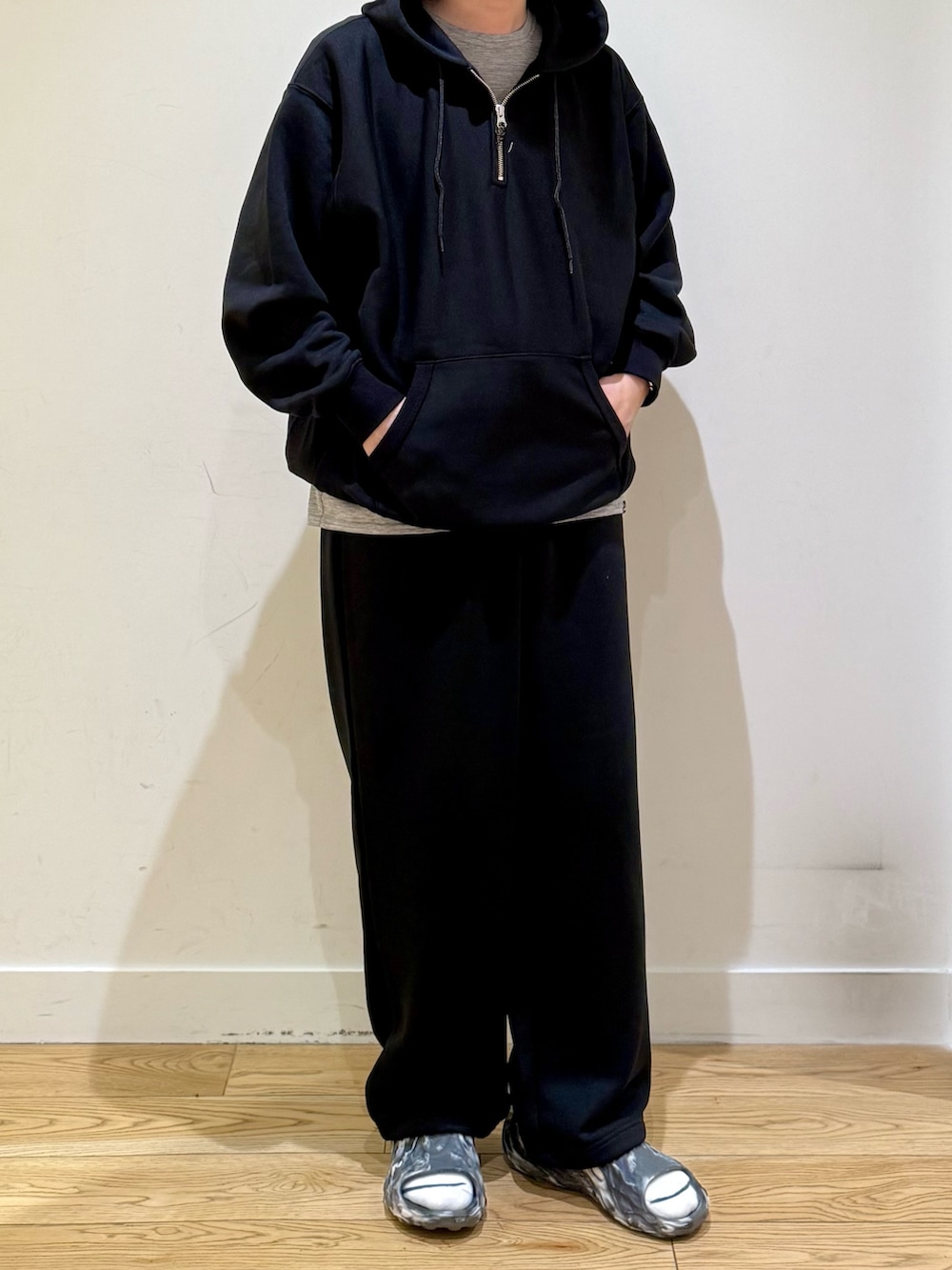 部屋着になりやすいスウェットのセットアップですがハーフジップパーカーなので引き締まって映ります◎