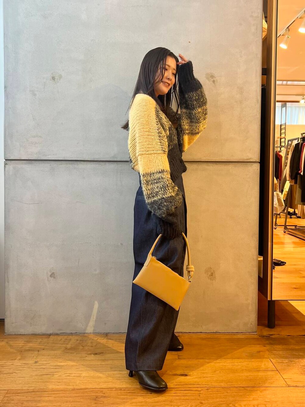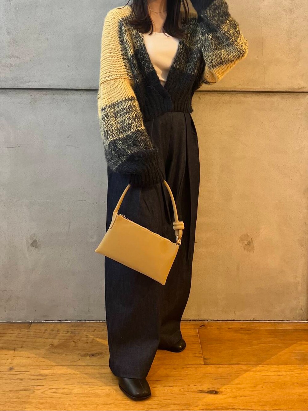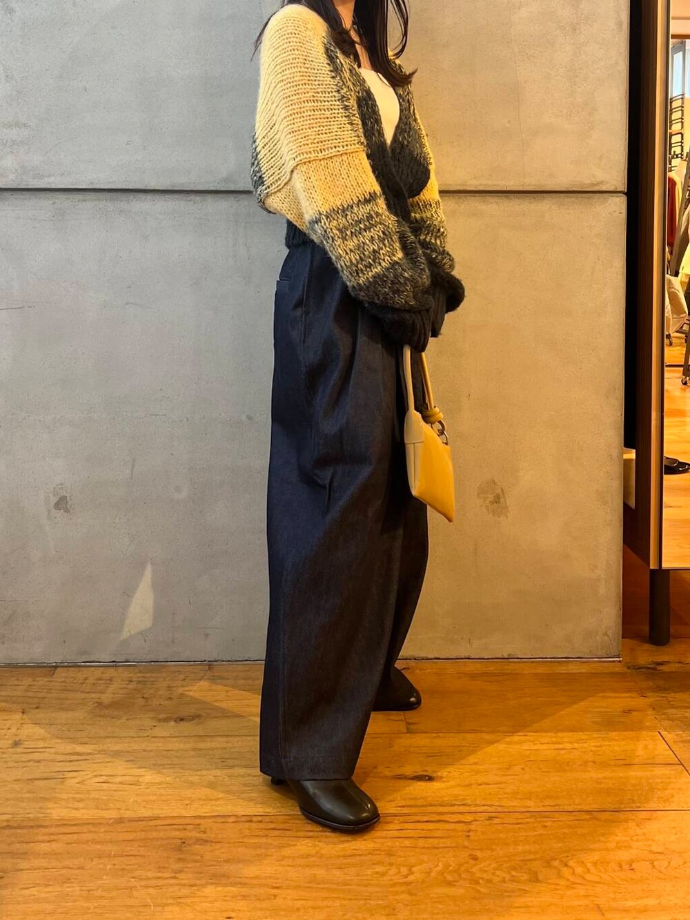 デニムは結構ボリューム感があるので、トップスは身体のラインがわかるスッキリしたものをインするか、ショート丈のもので合わせてメリハリをつけてコーデを組んでいただくのがおすすめです!