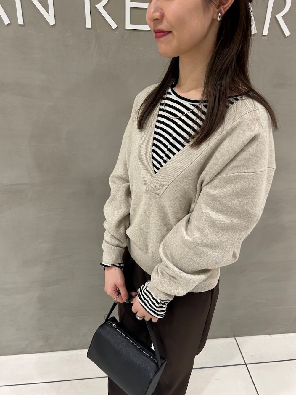 Vネックニットは合わせやすいキナリベージュでして、インナーを変えていただくだけで様々な雰囲気をお楽しみいただけます!