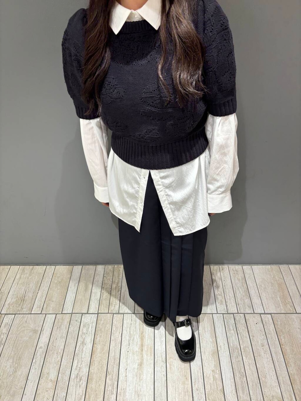 厚手の生地で朝晩は冷え込むけれど日中は暑いこの時期にピッタリの半袖ニットです!パフスリーブになっているので二の腕カバーにもってこいのアイテムです👍🏻骨格ストレートさんは肩幅が若干気になるかと思いますが、その分厚底などで下に重心を持ってくるとマシになるかと思います✌🏻フェミニンなアイテムになっているので、個人的にプリーツスカート合わせが学生っぽくて可愛いです♡