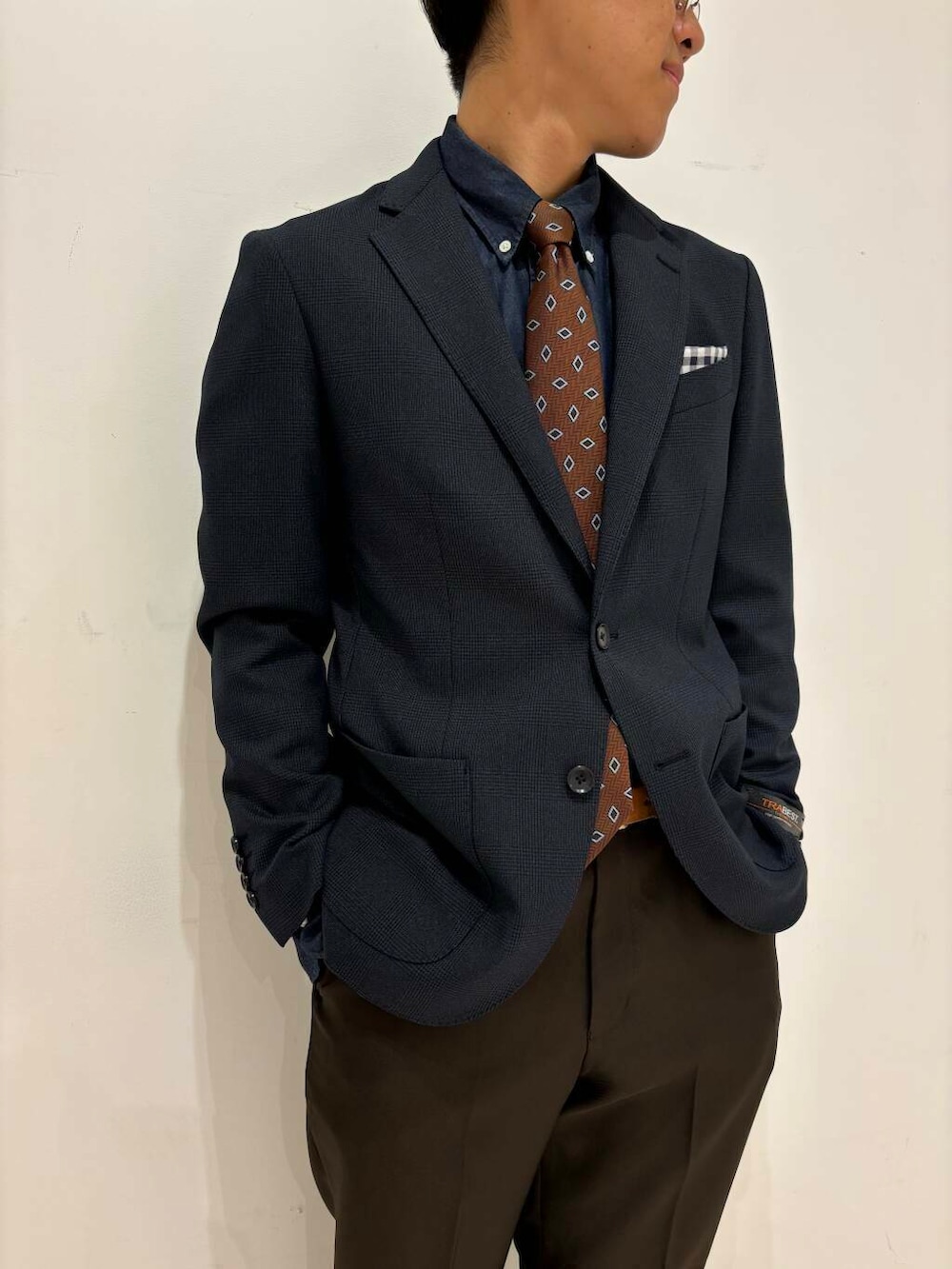 グレンチェックのジャケットに濃紺のシャンブレーシャツを合わせました。
