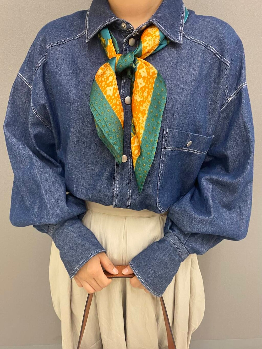デニム素材はカジュアルに見えがちですが、首元のスカーフが全体の雰囲気を変えてくれます^^